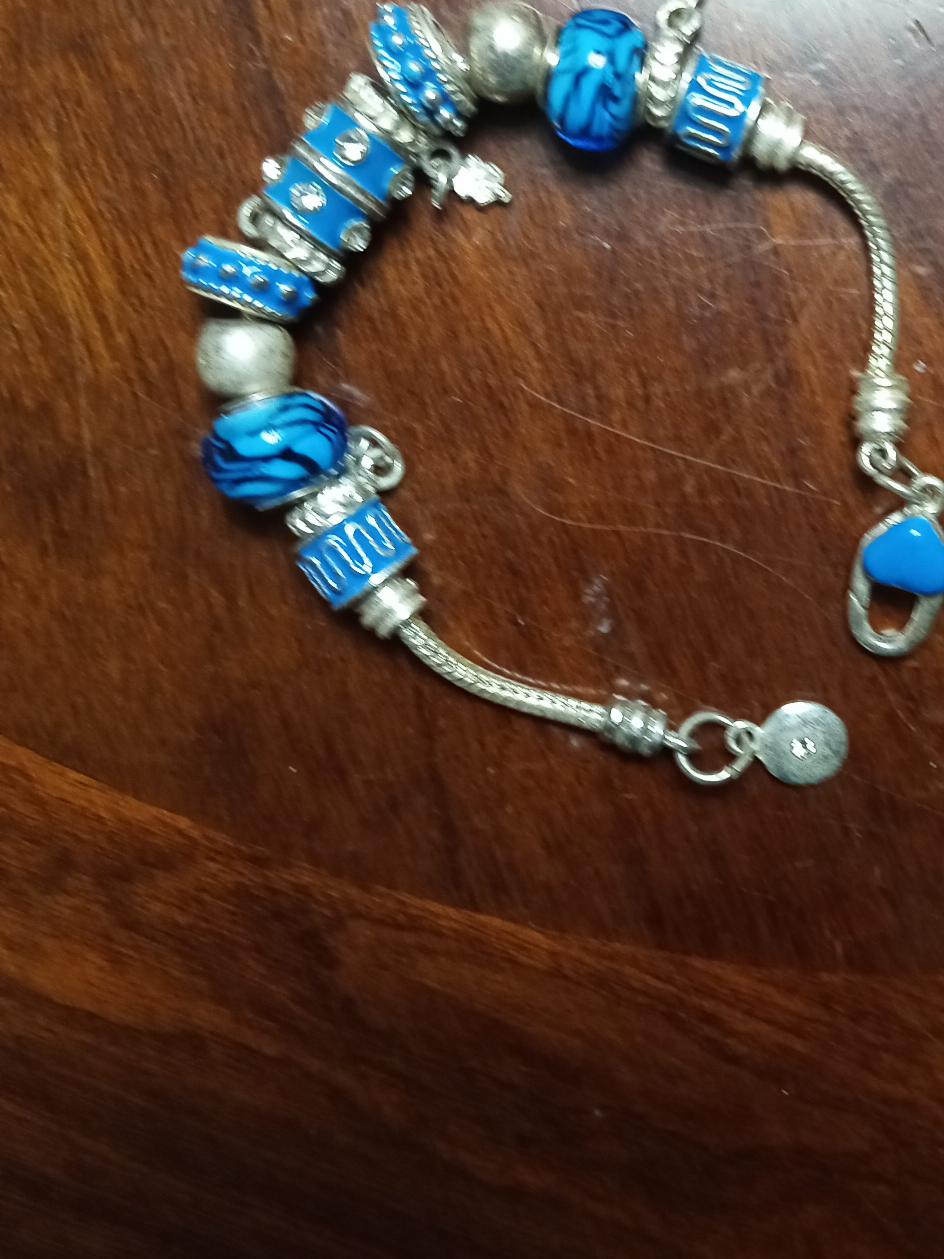 Selling a cute blue charm bracelet! It features a silver chain with various blue and silver beads and charms. Perfect for adding a pop of colour to your outfit