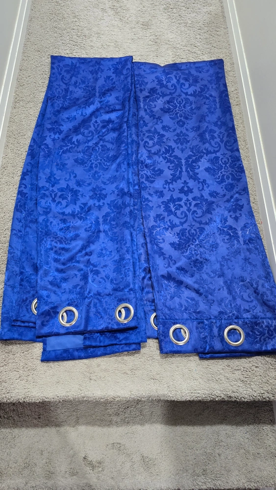 Selling a pair of new blue curtains with a damask pattern. They have grommets at the top for easy hanging, and has a good length. Great for adding a pop of colour to any room.