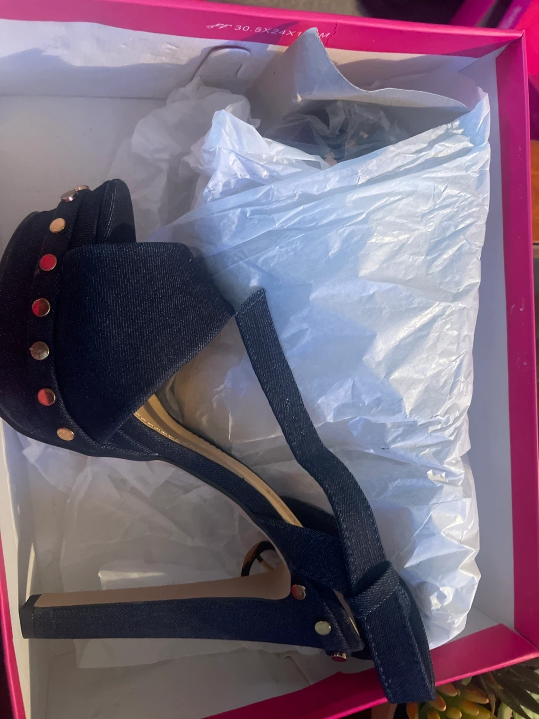 These blue denim heels are super cute and in great condition! Size 8 They feature gold stud detailing. Comes with the original box!