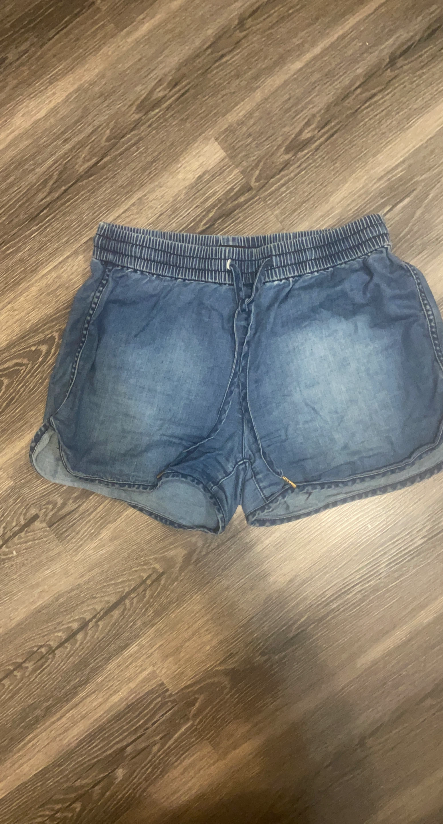 10Selling a pair of denim shorts. They are a light blue colour and have an elastic waistband with a drawstring. Perfect for summer!