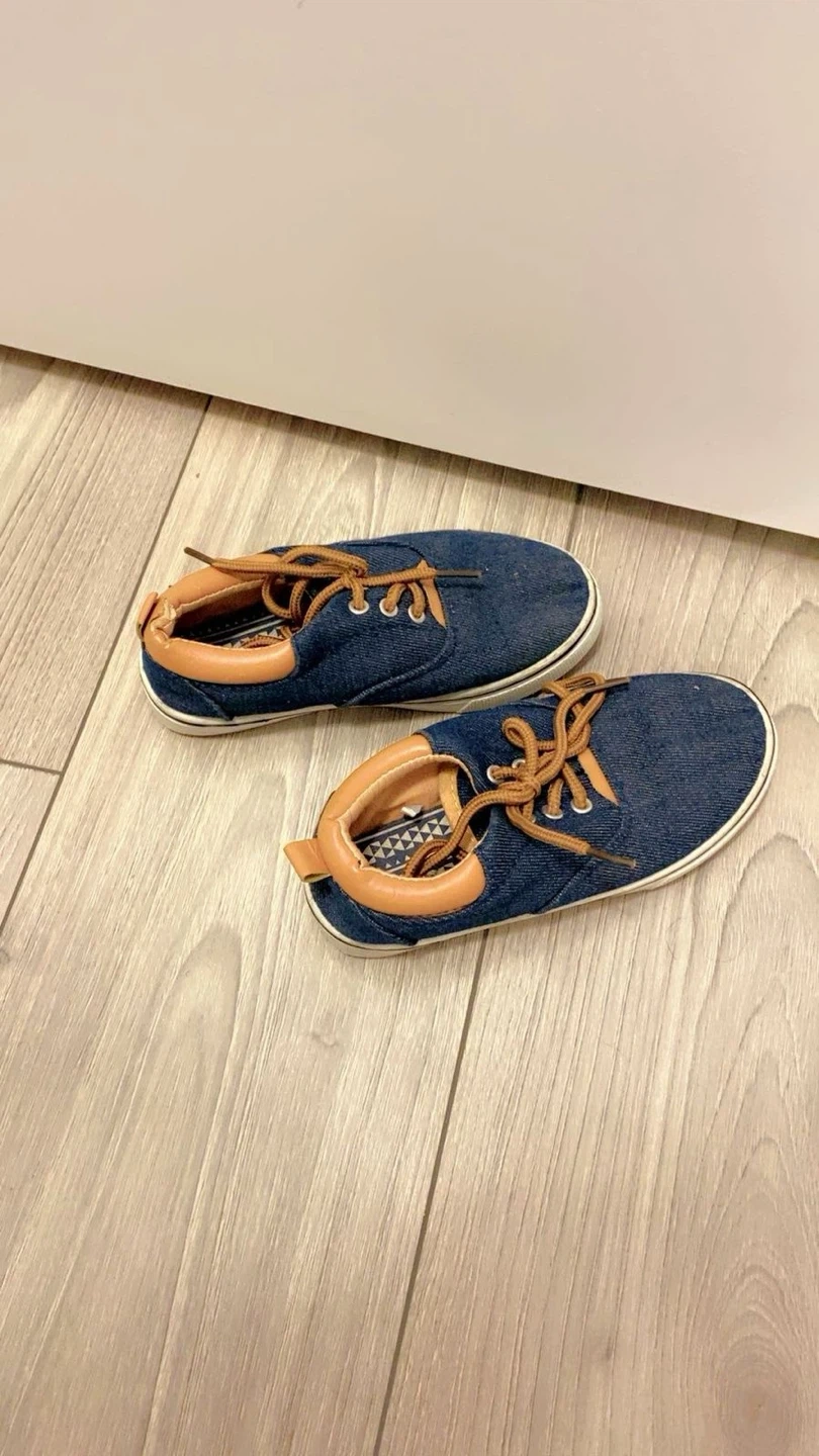 60Selling a pair of casual shoes with a denim-like material! They feature brown laces and trim, and a white sole. Perfect for everyday wear!