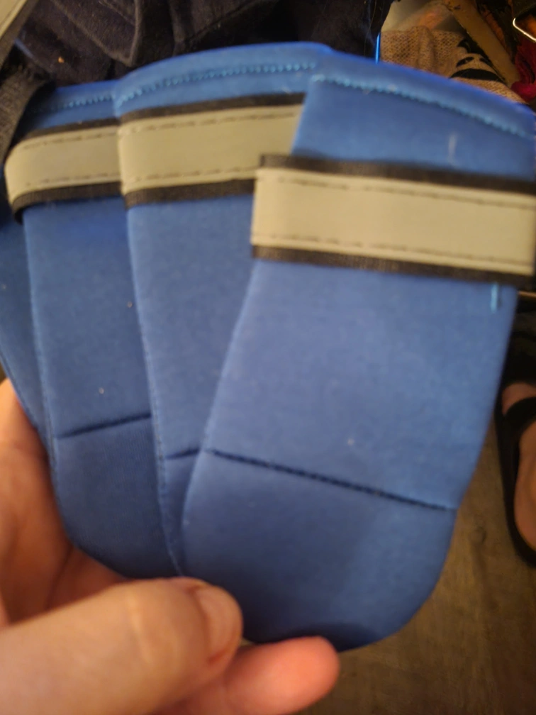These are blue dog boots with reflective straps. They are in good condition and ready for your furry friend!