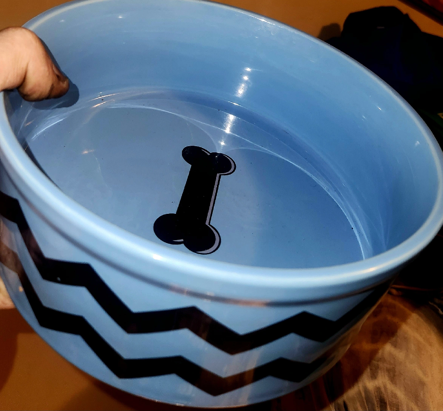 Selling a decent sized cute blue dog bowl with a bone design on the inside and a black chevron pattern around the outside. It's in great condition and ready for a new furry friend! Pickup Only.
