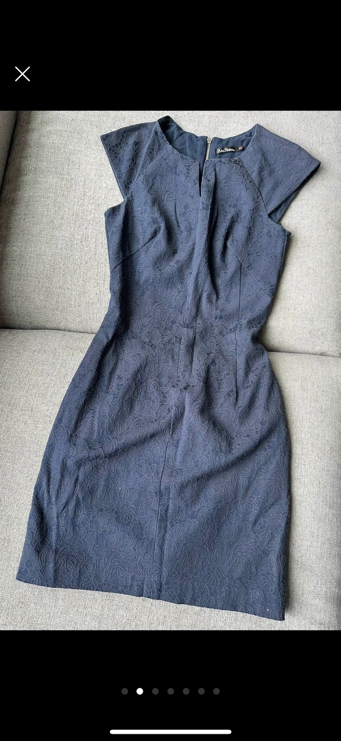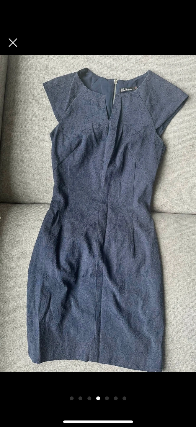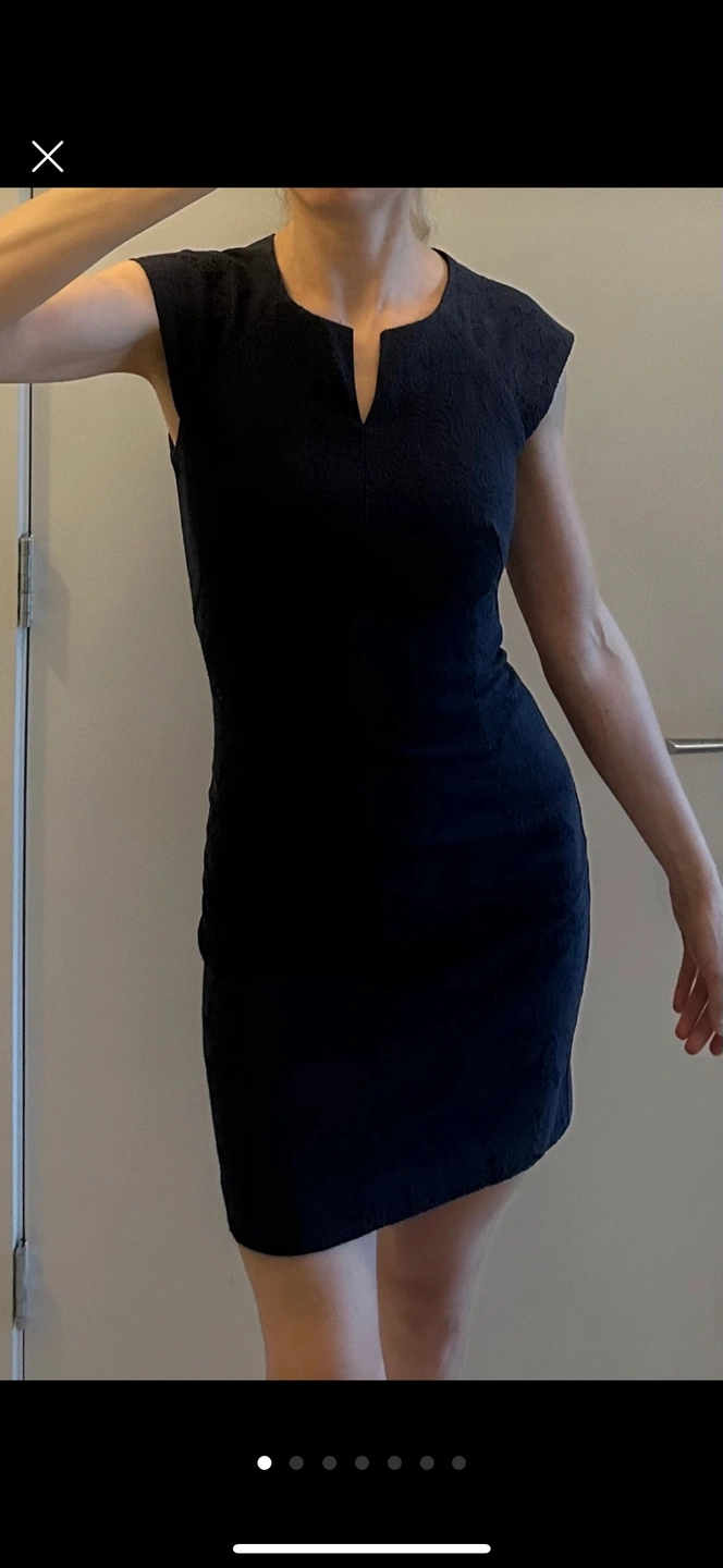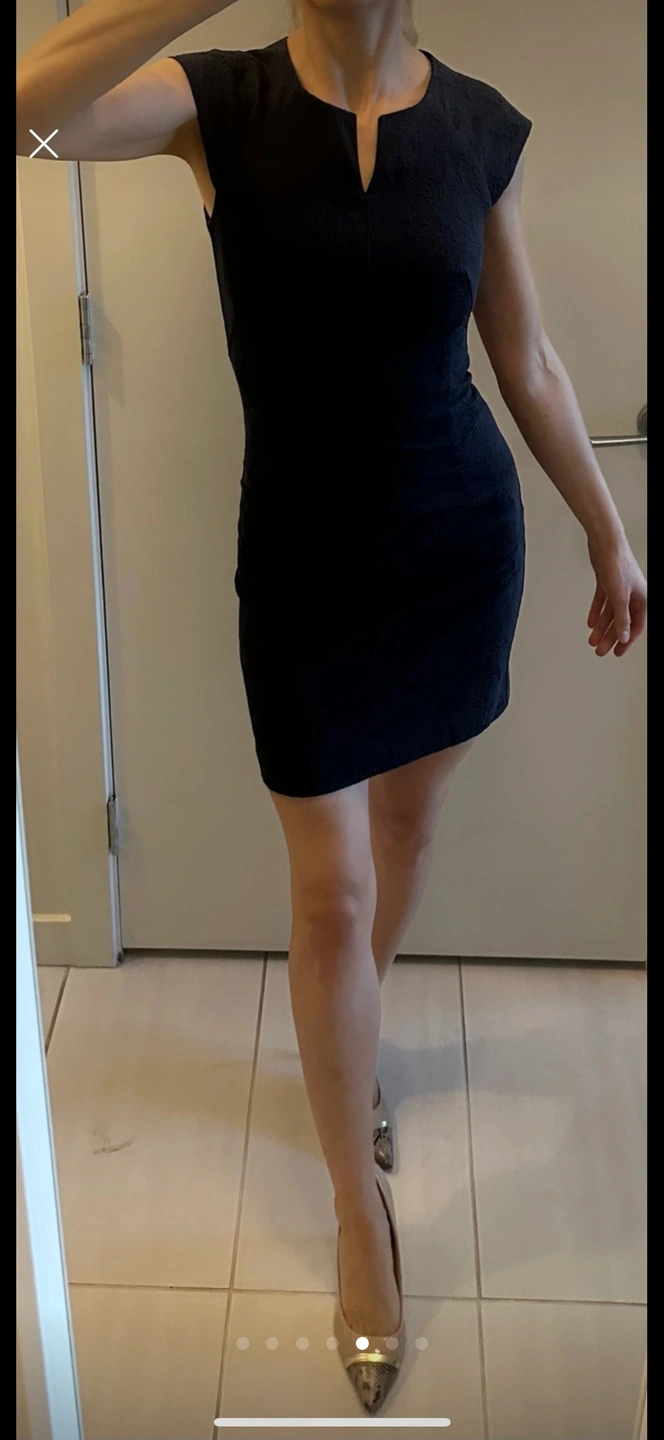 545Fitted dress with a v-neck, cap sleeves, and a back zipper. The dress is made of a textured material. It is above the knee in length. Xs