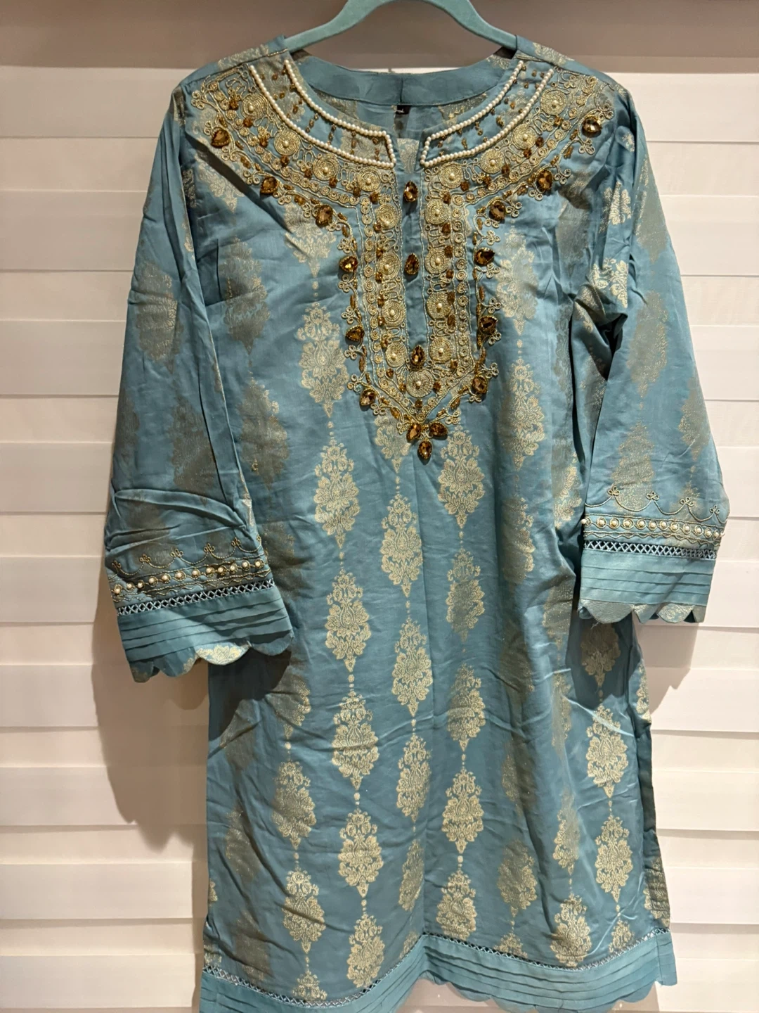 20Beautiful blue kurti with gold embroidery and pearl detailing. It has a unique design and is perfect for special occasions or everyday wear. The material is lightweight and comfortable.