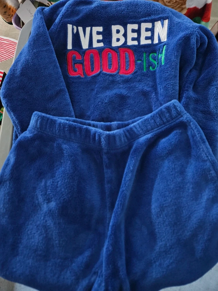 940Cozy up in this super soft blue fleece pajama set! The top features the fun saying "I've Been Good-ish", perfect for lounging around the house or getting a good night's sleep