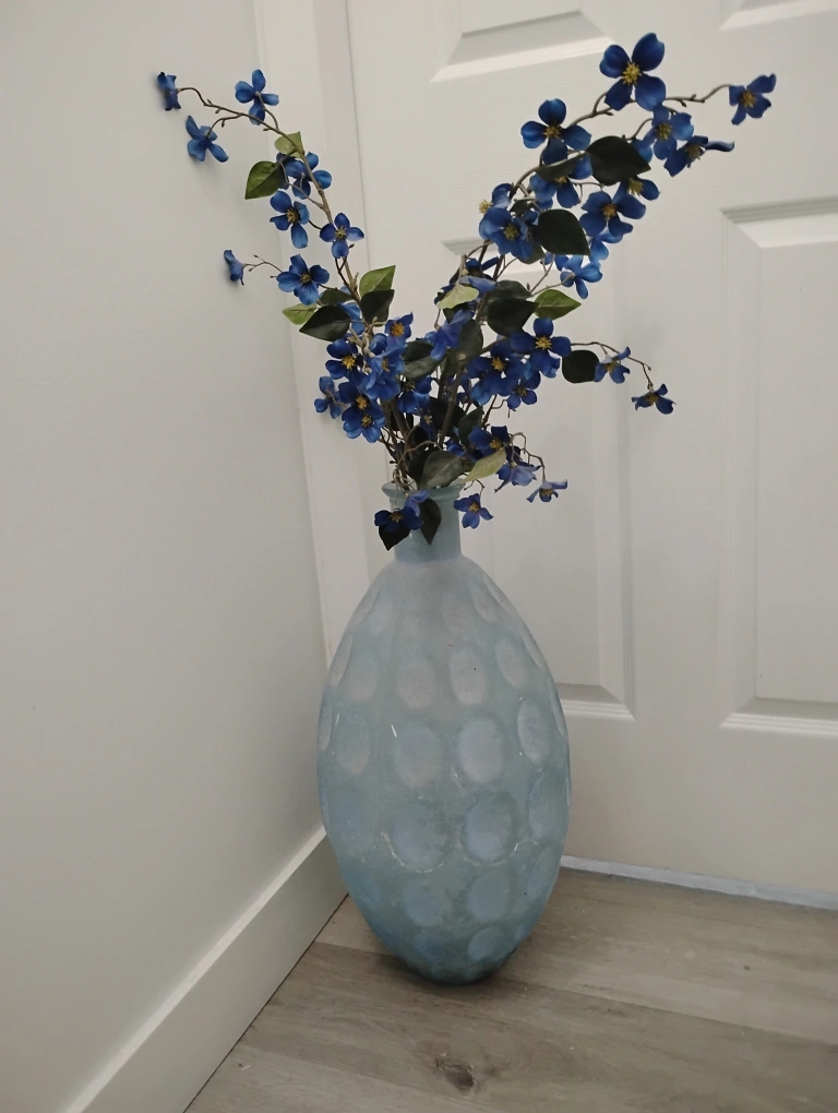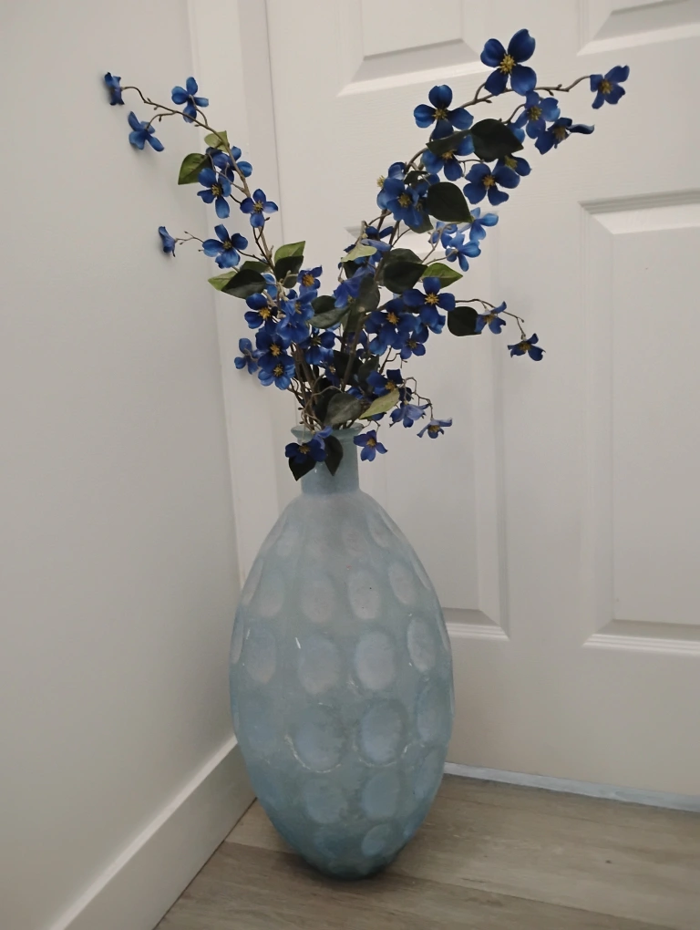 A lovely blue floral arrangement in a light blue vase. This would be a beautiful addition to any room!