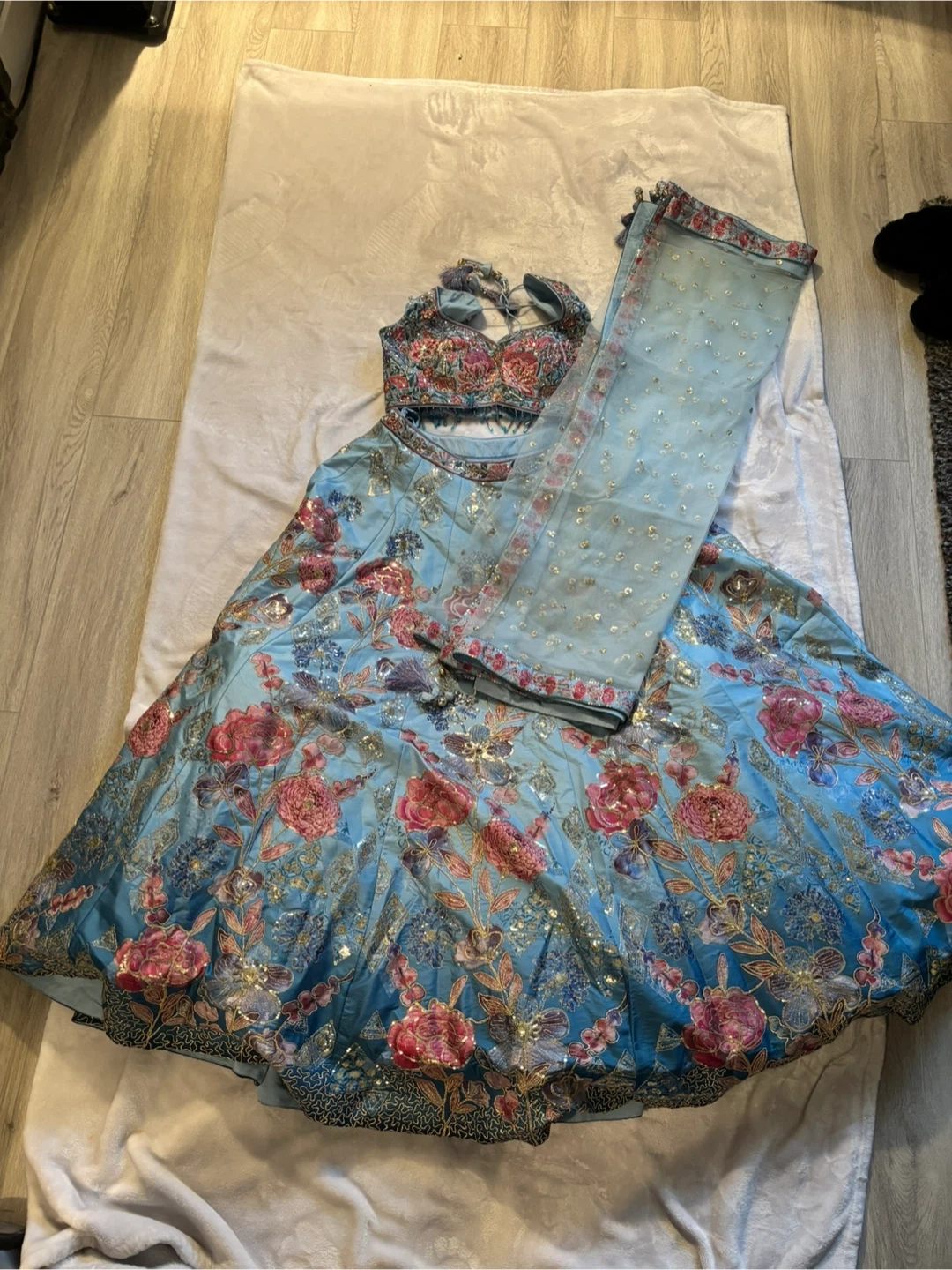 10Beautiful blue lehenga choli set with floral detailing. This set includes the lehenga (skirt), choli (blouse), and dupatta (scarf). Perfect for a special occasion or celebration!