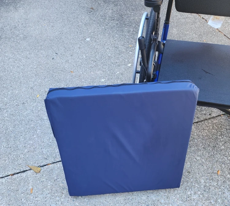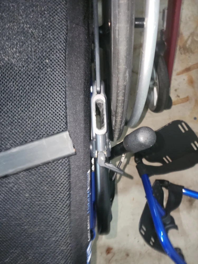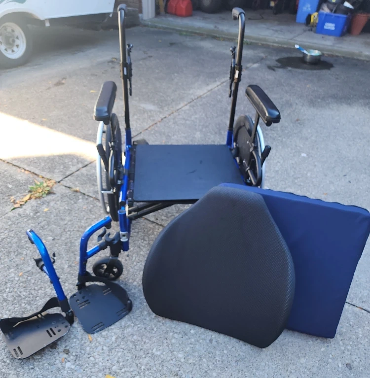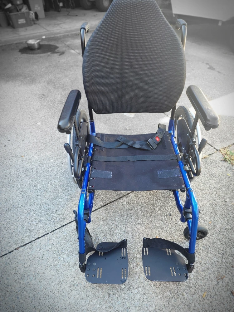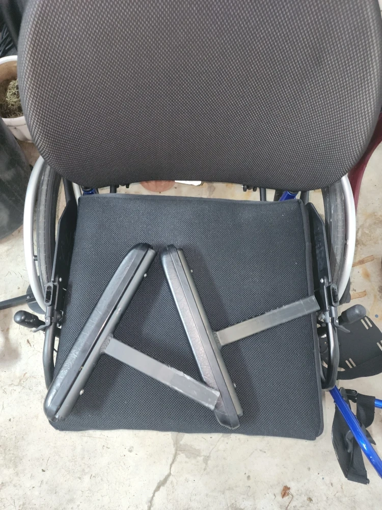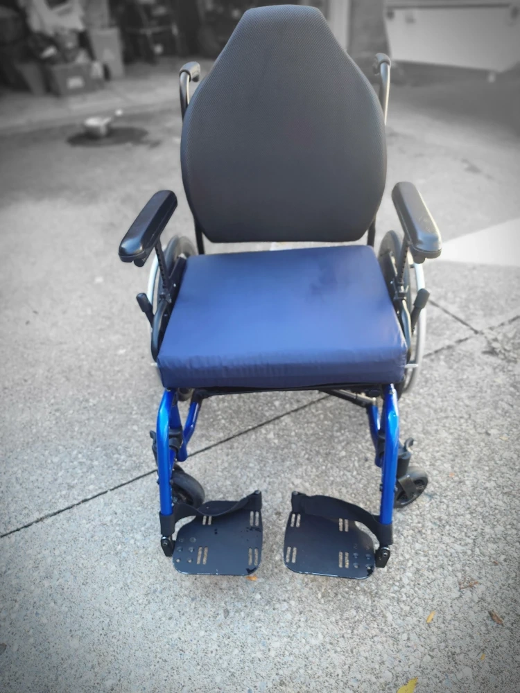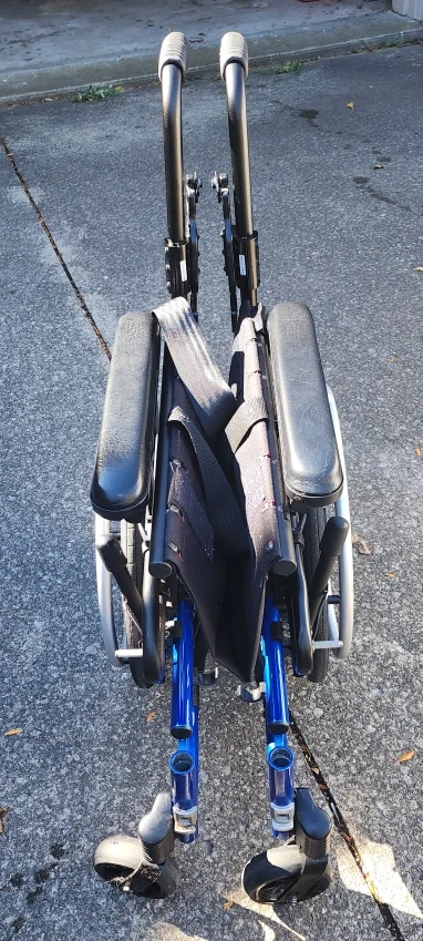 21Selling a foldable wheelchair with a blue frame and black seat. It looks to be in good condition and ready to use. Great for anyone needing a lightweight and portable mobility solution!