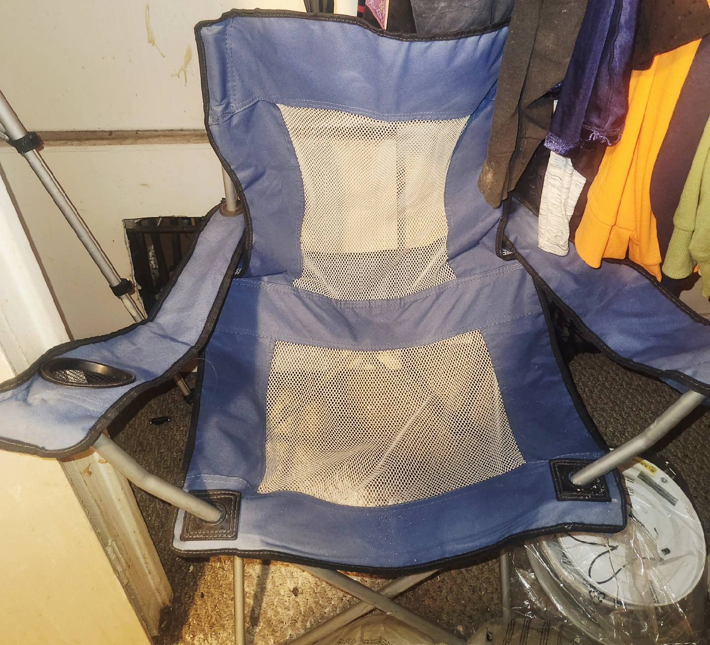 Selling a blue folding camp chair. It's in good condition and perfect for camping, picnics, or just relaxing in the backyard. It's lightweight and easy to carry, with a built-in cup holder for your convenience pick up only.