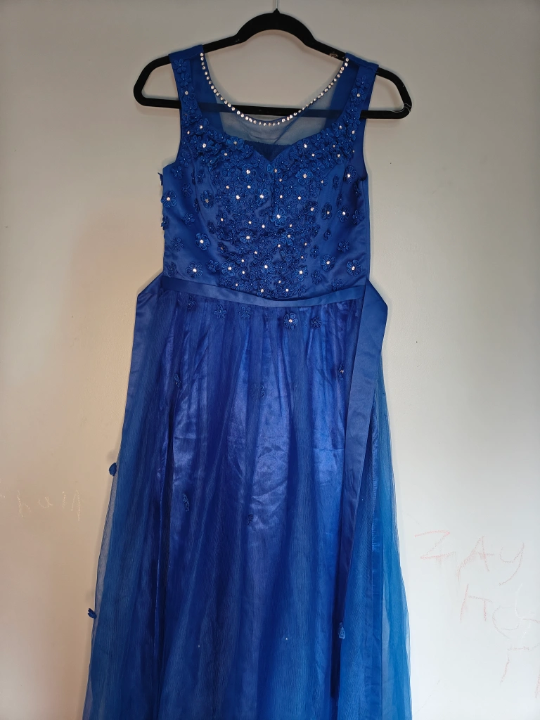 10This is a beautiful blue formal dress. It features intricate floral embroidery and delicate beading around the neckline. The dress has a flattering silhouette and is perfect for special occasions