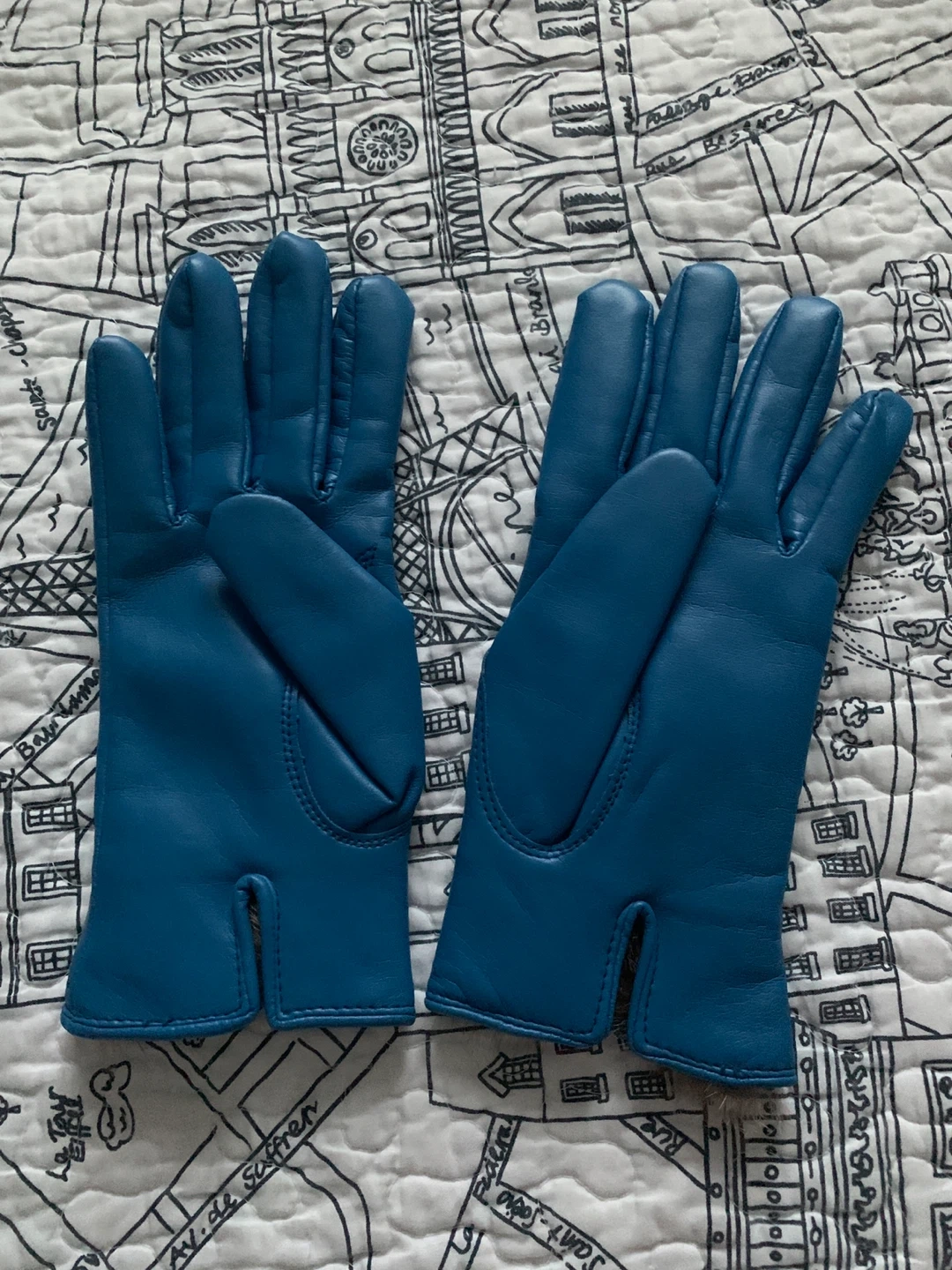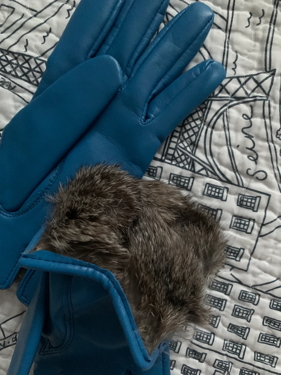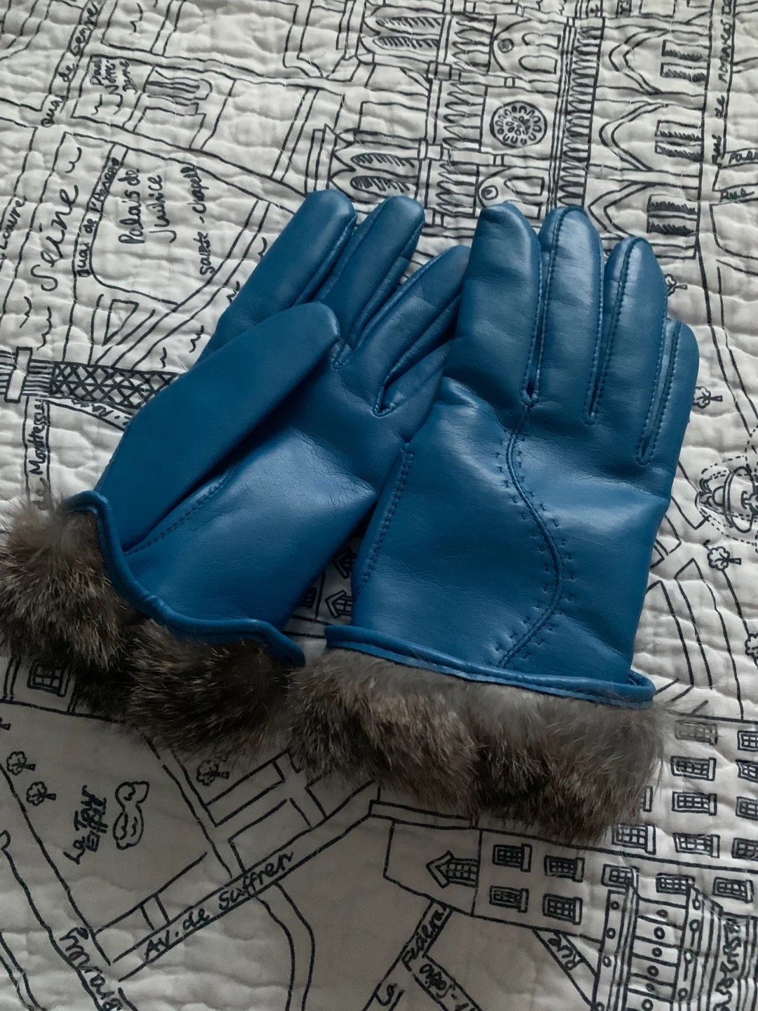 25These are a pair of stylish blue leather gloves with a fur all way inside. They're in new condition and ready to keep your hands warm and fashionable!