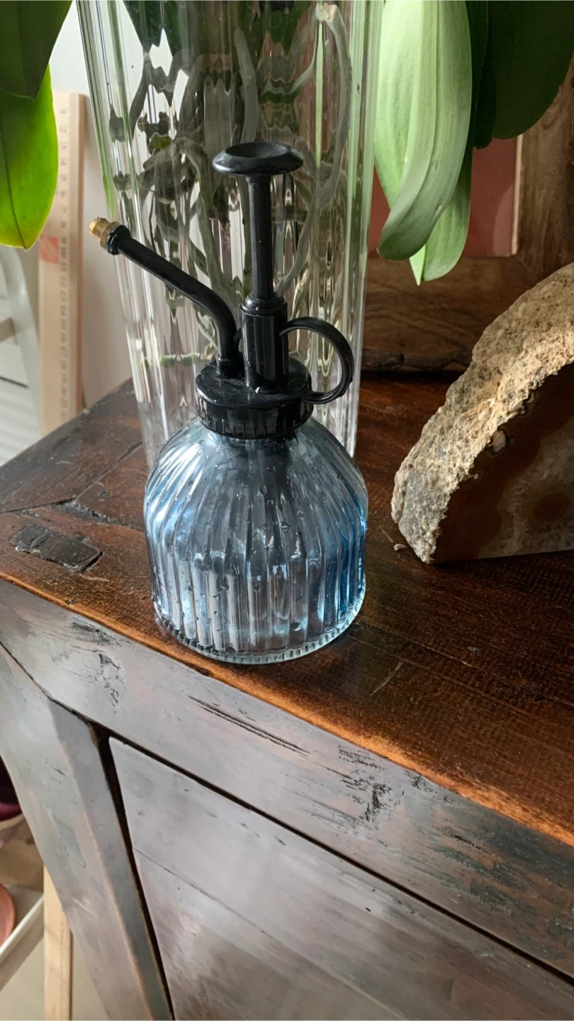 A lovely blue glass plant mister for keeping your plants happy and hydrated! The mister has a black pump and a brass nozzle. It's in great condition and ready to find a new home.