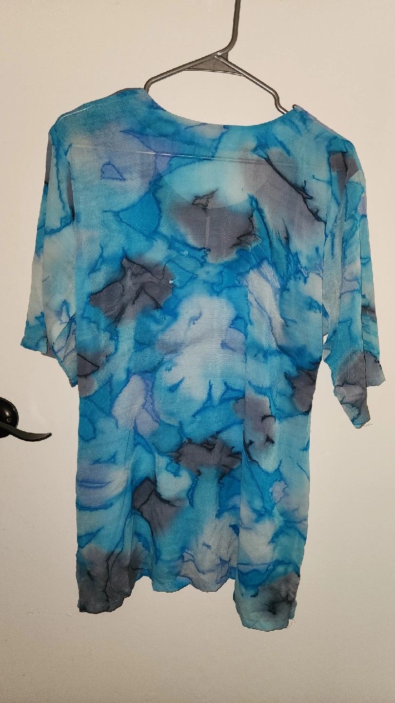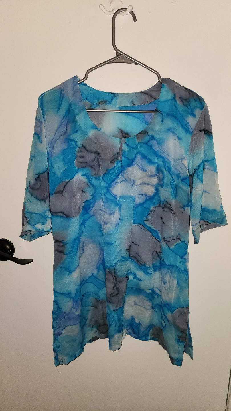 A lovely blouse with a unique blue and grey pattern. It has short sleeves and a comfortable fit. Perfect for adding a pop of colour to your wardrobe!
