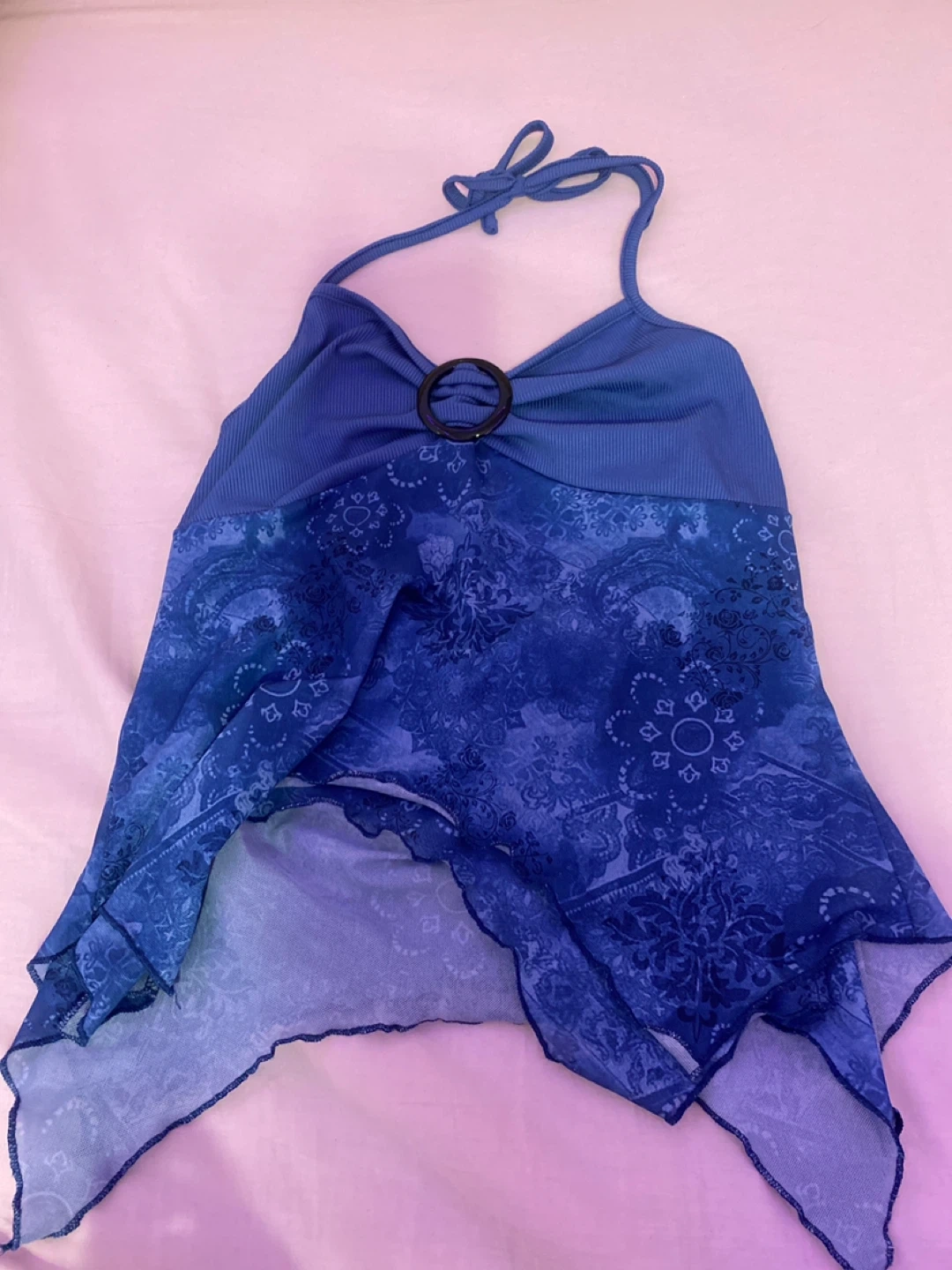 Cute blue halter top with a ring detail. It features a unique pattern and a flowy hem. Perfect for summer.