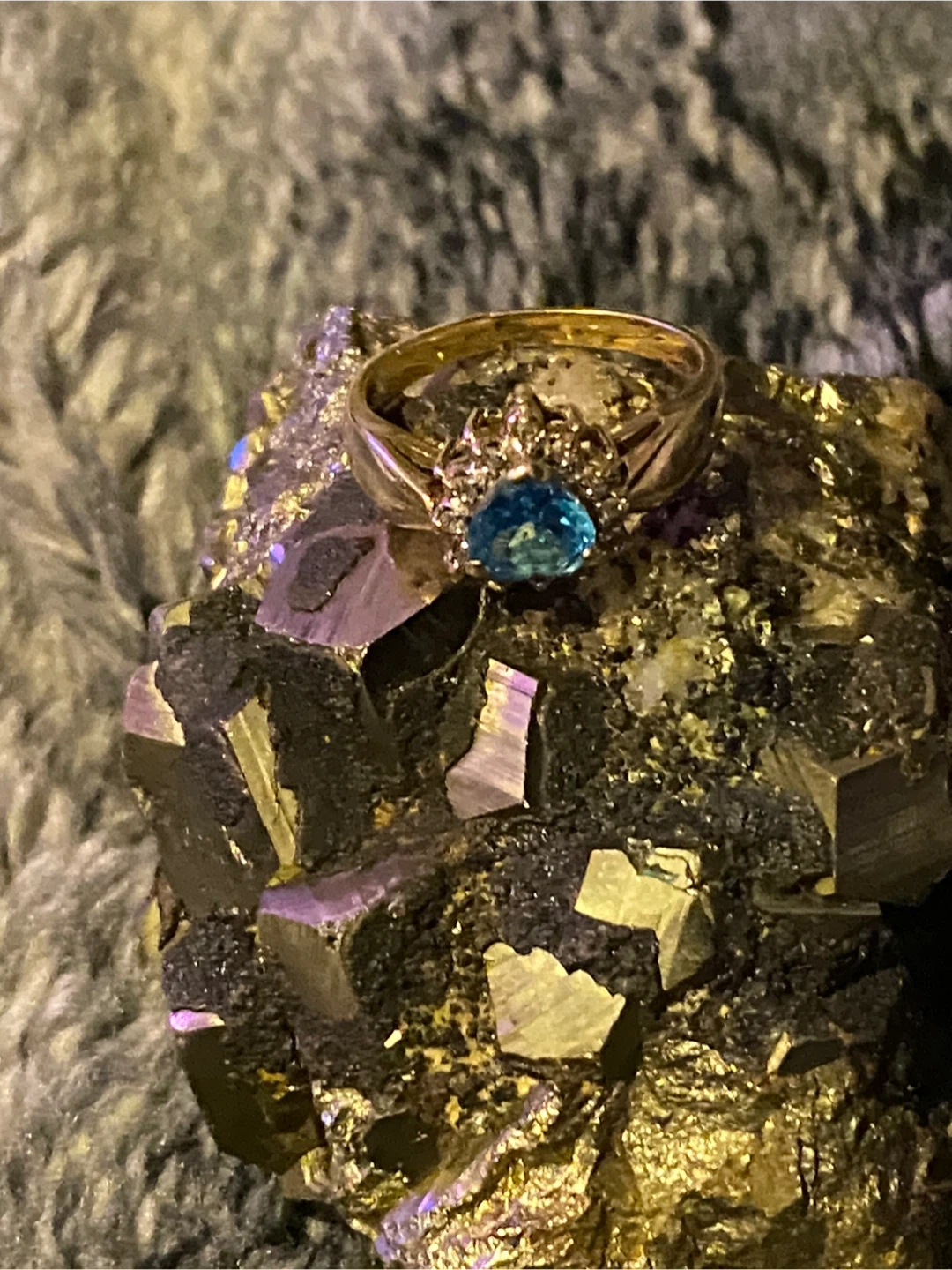 103Selling a 10 karat 3.2 grams gold ring size 7 with a blue heart-shaped stone, surrounded by smaller stones. It's in good condition and ready for a new home!