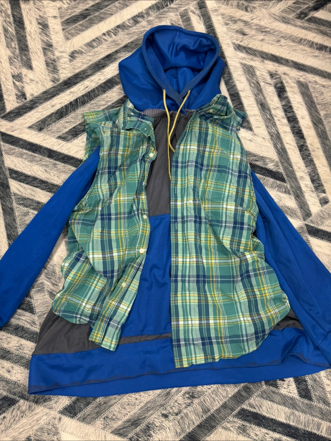 Selling a comfy blue hoodie paired with a stylish plaid shirt. Both are in great shape and ready for a new home! Sewn together for a costume.
