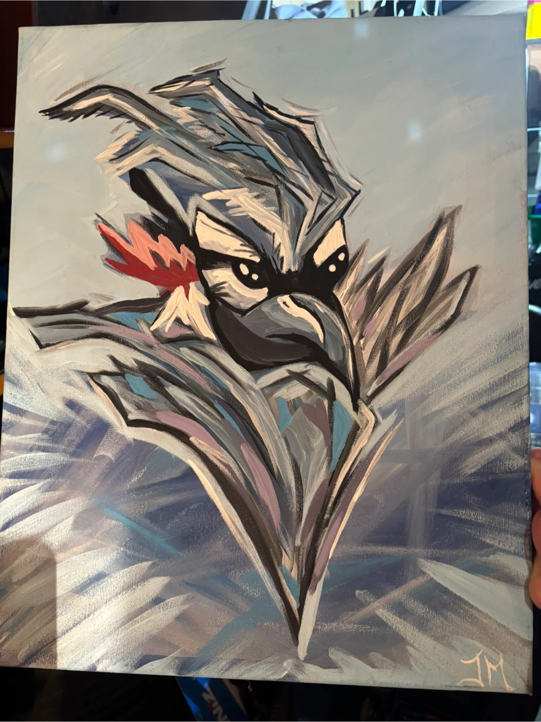 This is a painting of a blue jay. It would look great in any room of your house! Painted by hand . Asking $ 8 . Small painting , sizes will be provided to serious inquiries
