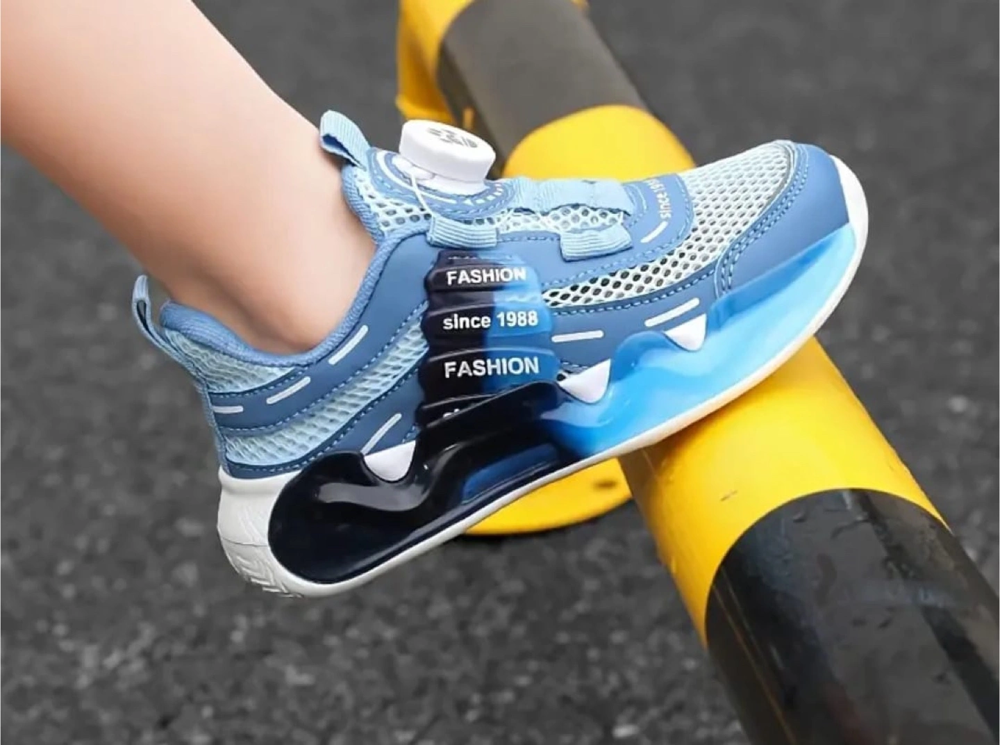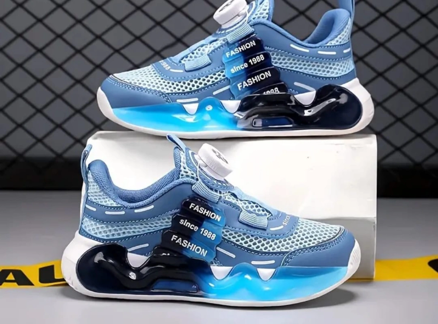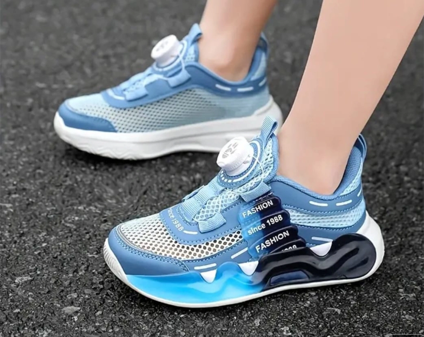 10These blue kids' sneakers are in great condition! They feature a unique design with a rotating button and a stylish blue, white, and black colour scheme. The size is 13.5 Little Kid, perfect for growing feet!