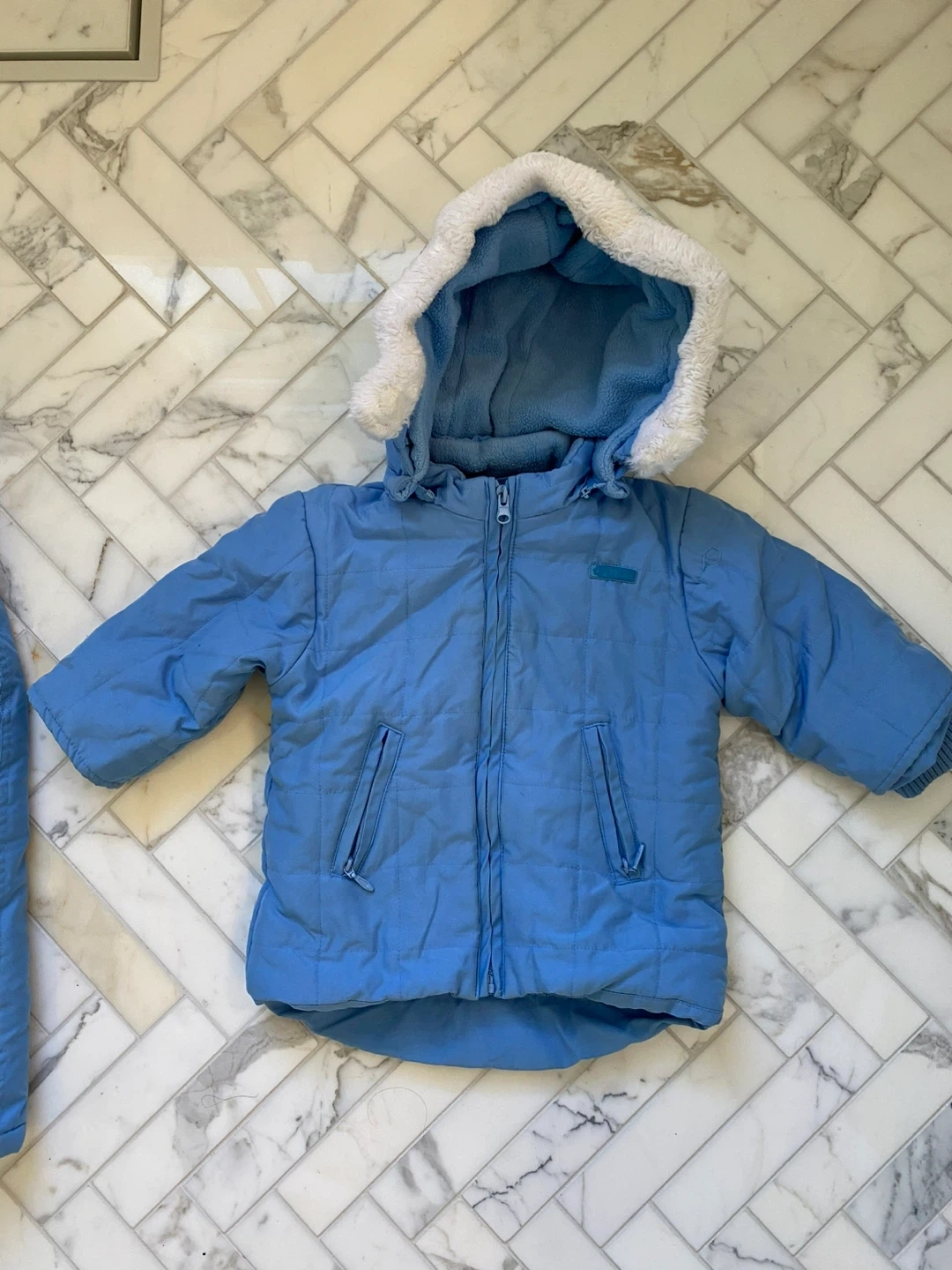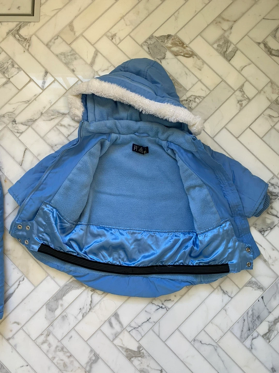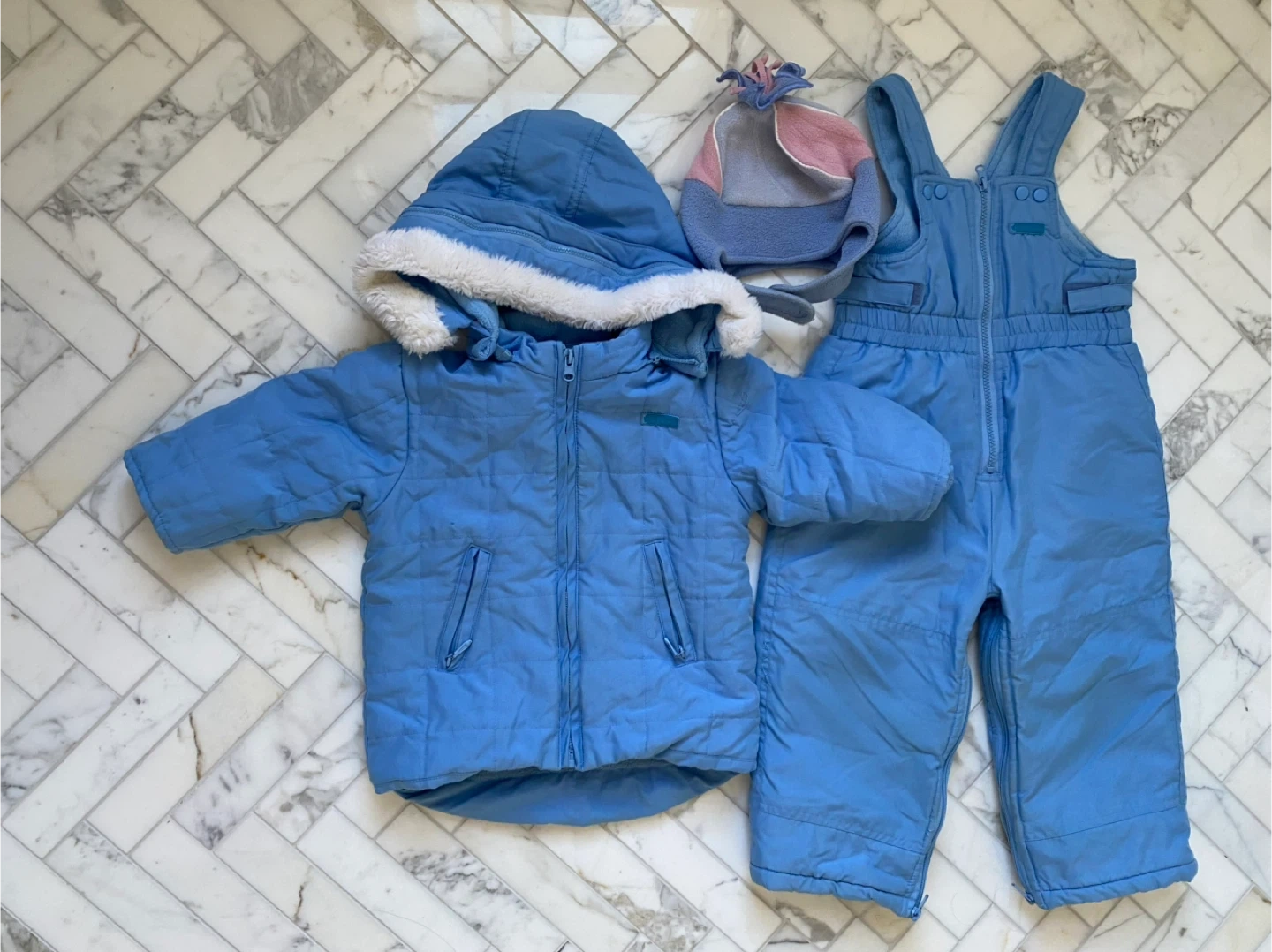 0A cute and cozy blue snowsuit set for kids! Includes a jacket with a hood, overalls, and a matching hat to keep your little one warm during the winter months. Perfect for outdoor play and snowy adventures. Slight stain in sleeve, price adjusted accordingly.