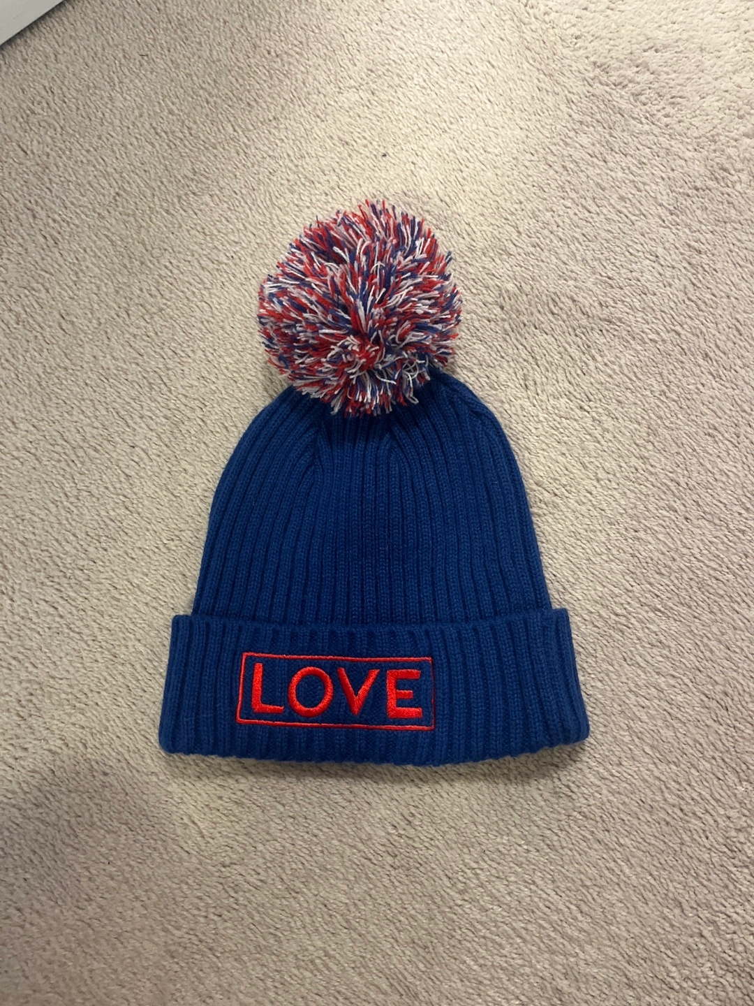 Cozy blue knit beanie with a fun red 'LOVE' patch! It's in great shape and ready to keep you warm this winter. The pompom on top adds a bit of flair!