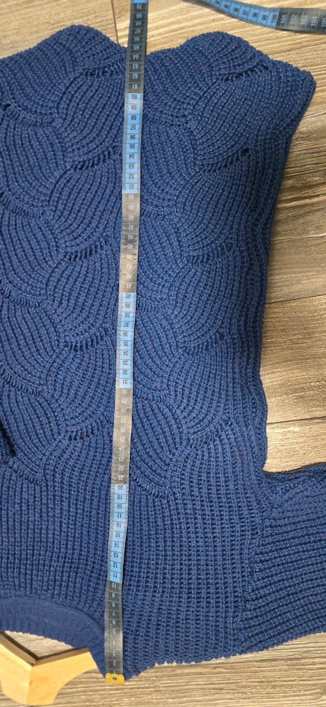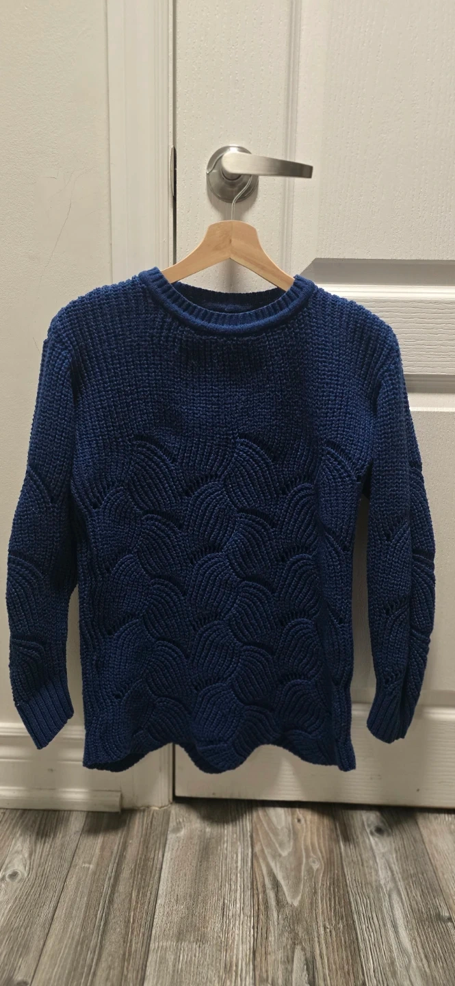 70Cozy blue knit sweater in great condition! The sweater has a unique textured pattern. It measures approximately 27 inches in length and the sleeves are about 25 inches long. Perfect for those chilly days!