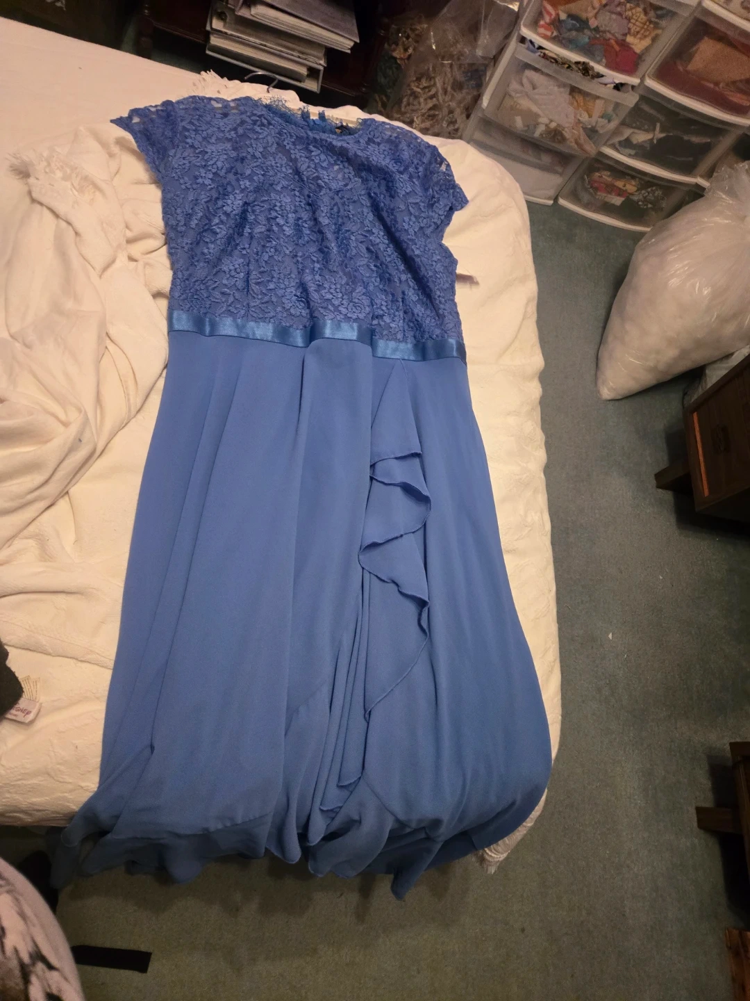 15Here's a lovely blue dress with a lace top! It's in great condition and ready for a new home. The dress features a ribbon detail and a stylish ruffle accent.