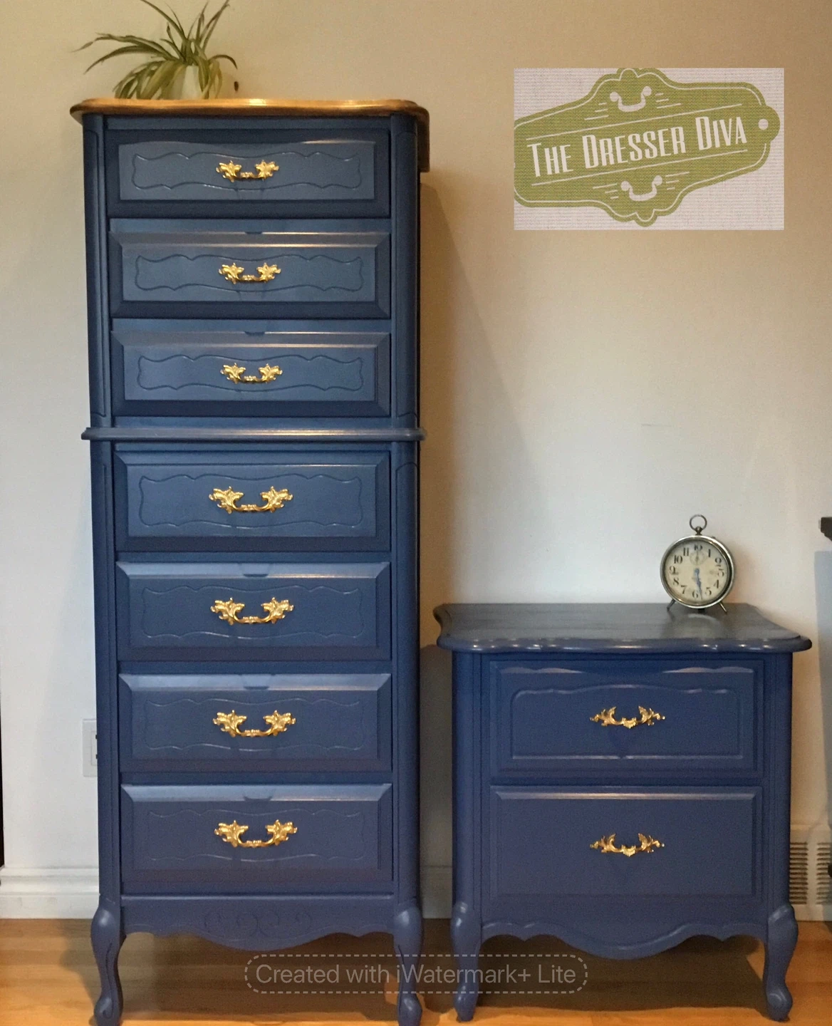 76Includes a tall lingerie dresser and a nightstand. The set is painted in a Tiffany blue colour with gold hardware. Perfect for adding a touch of elegance to your bedroom! Dresser measures 21 x 18 x 57” high Nightstand measures 24 x 16 x 24” high Pick up near Mooney’s Bay. Delivery maybe available. Both pieces for $360