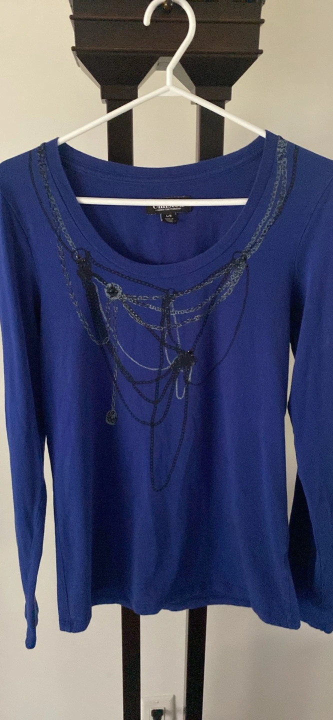 A lovely blue long-sleeved top . It's a size large and features a unique chain design on the front. Perfect for adding a pop of colour to your wardrobe!