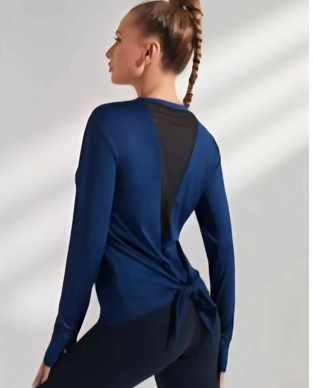 Here's a stylish blue long sleeve workout top! It features a mesh design on the back and a tie at the waist. Perfect for your next workout session