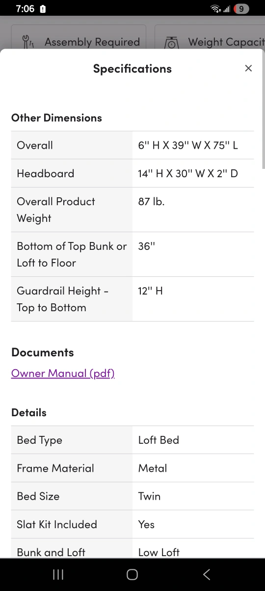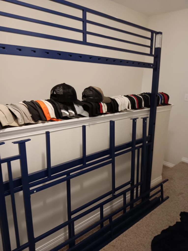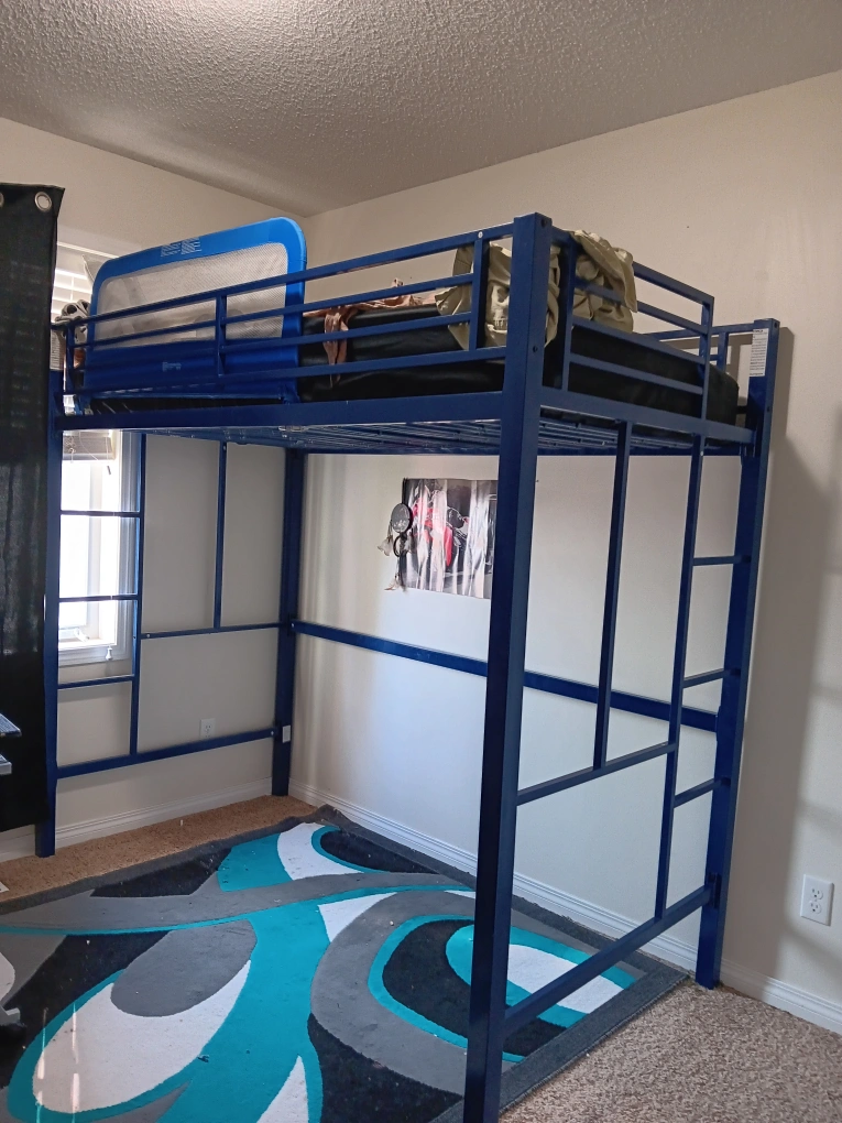 Selling a blue metal twin loft bed. Here are the dimensions: - Overall: 6" H x 39" W x 75" L - Headboard: 14" H x 30" W x 2" D - Bottom of Top Bunk or Loft to Floor: 36" - Guardrail Height - Top to Bottom: 12" H The bed type is a loft bed, and the frame is made of metal. taken apart for easy pick up. my son has out grown it. this is used like new. all pieces and bolts are together. no mattress, price reflects this.