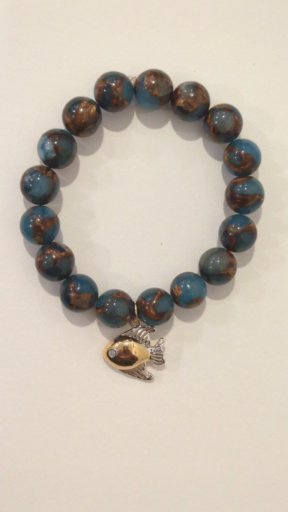 Blue Mosaic Quartz Beaded Bracelet with Gold Fish Charm