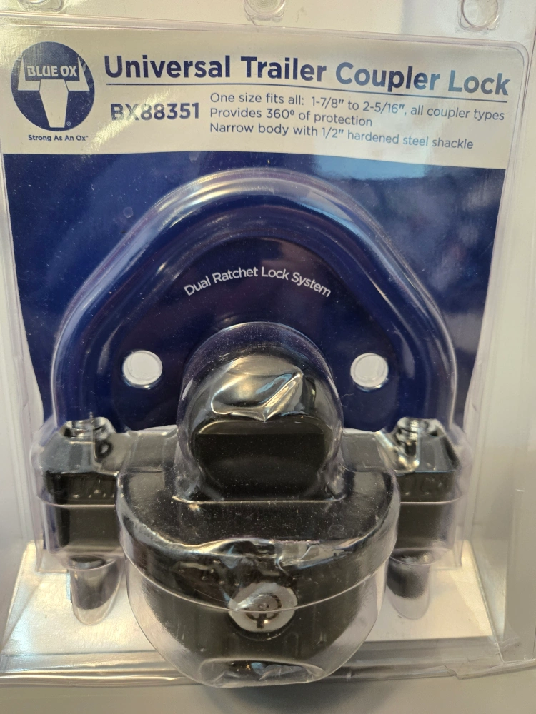 135New in package. Retails for $89.95. Universal trailer coupler lock. Fits all 1-7/8" to 2-5/16" couplers. Narrow body with 1/2" hardened steel shackle. Dual ratchet lock system. Includes two rugged tubular keys.