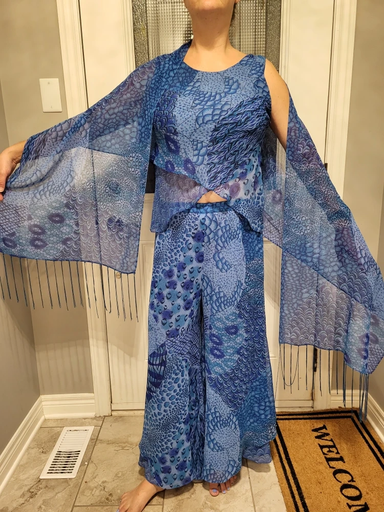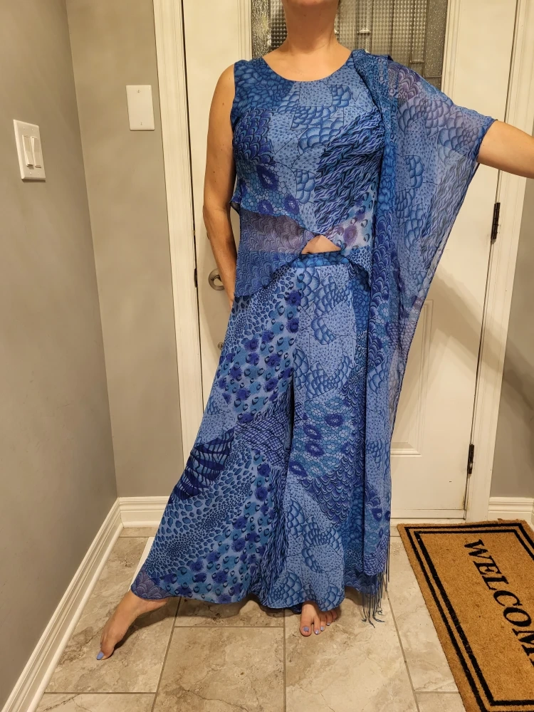 21REVERSIBLE- unique blue patterned 3-piece outfit! It includes a sleeveless reversible (double sheer) top (which can been pulled down further as model is very tall), wide-leg double sheer fabric reversible palazzo pants with button closure and a sheer shawl. Like new as only worn twice.