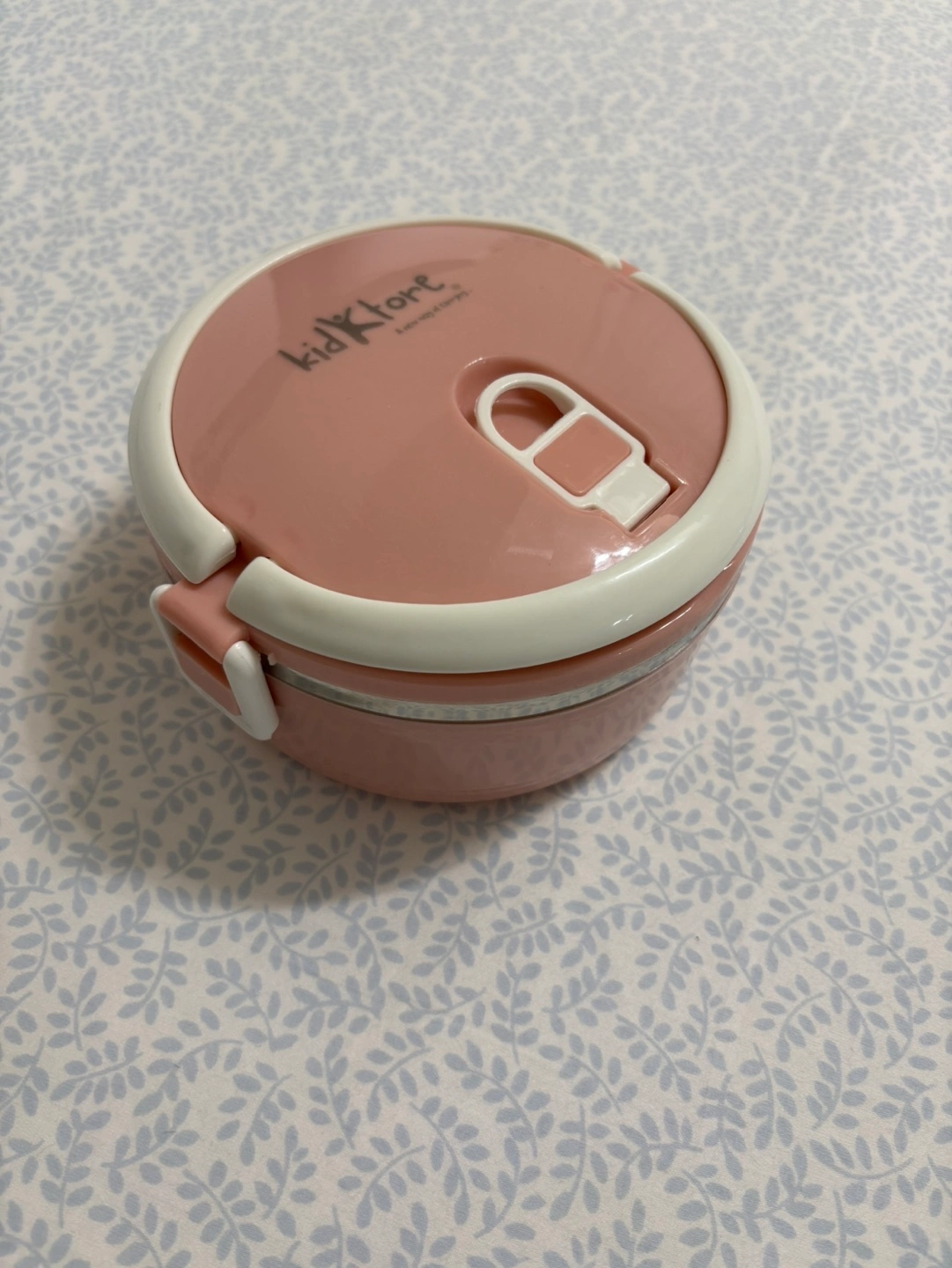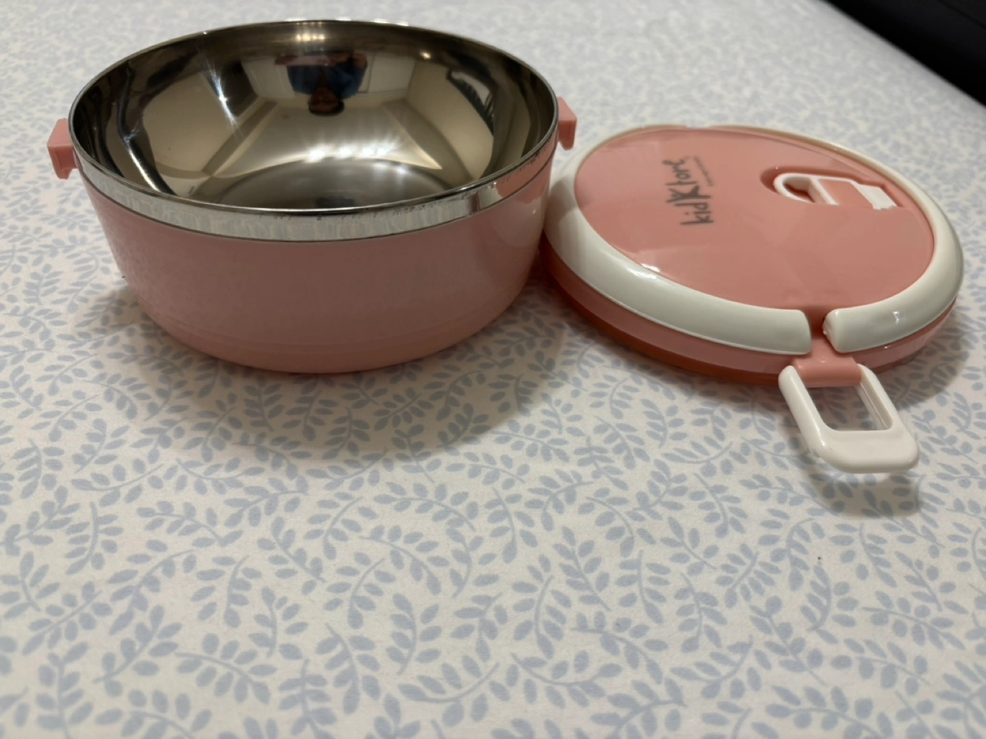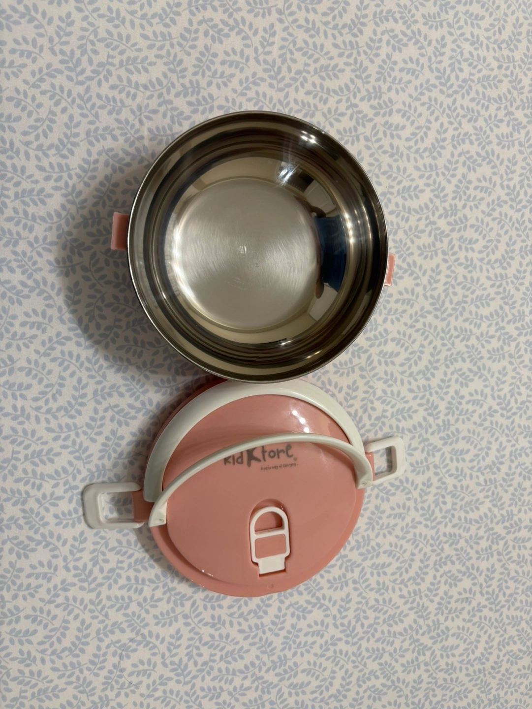 Pink stainless steel lunchbox. Features a inner bowl and a secure lid. Perfect for kids' lunches or snacks.