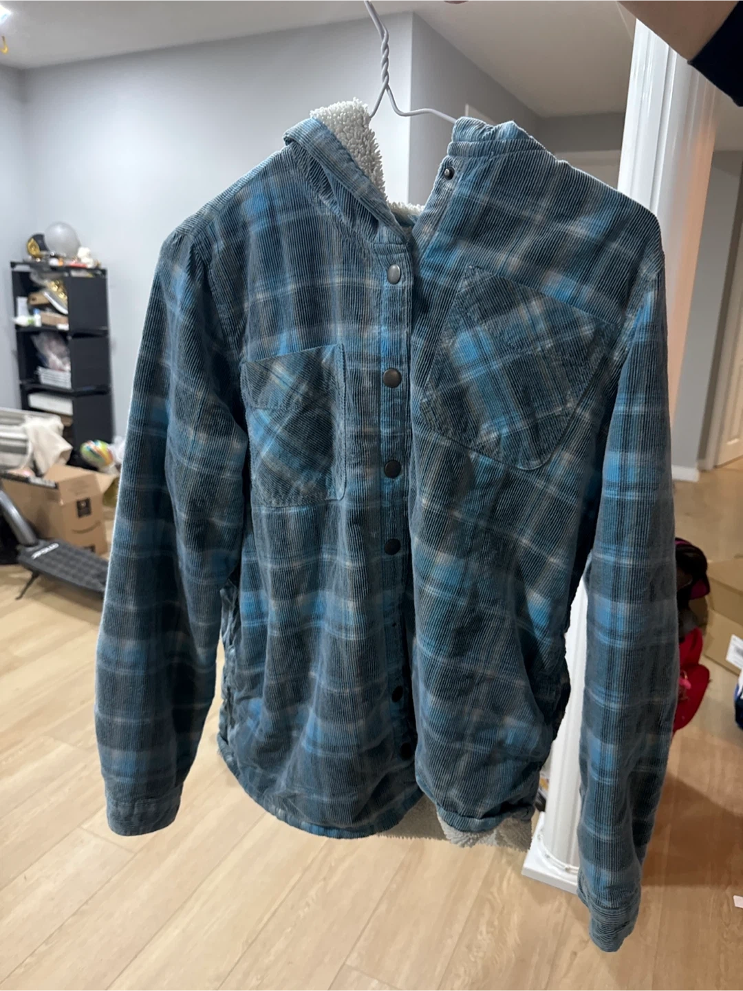 70Cozy up in this blue plaid corduroy jacket! It features a sherpa lining and a hood to keep you warm on chilly days. The jacket has a button-up front and two chest pockets. Perfect for layering or wearing on its own