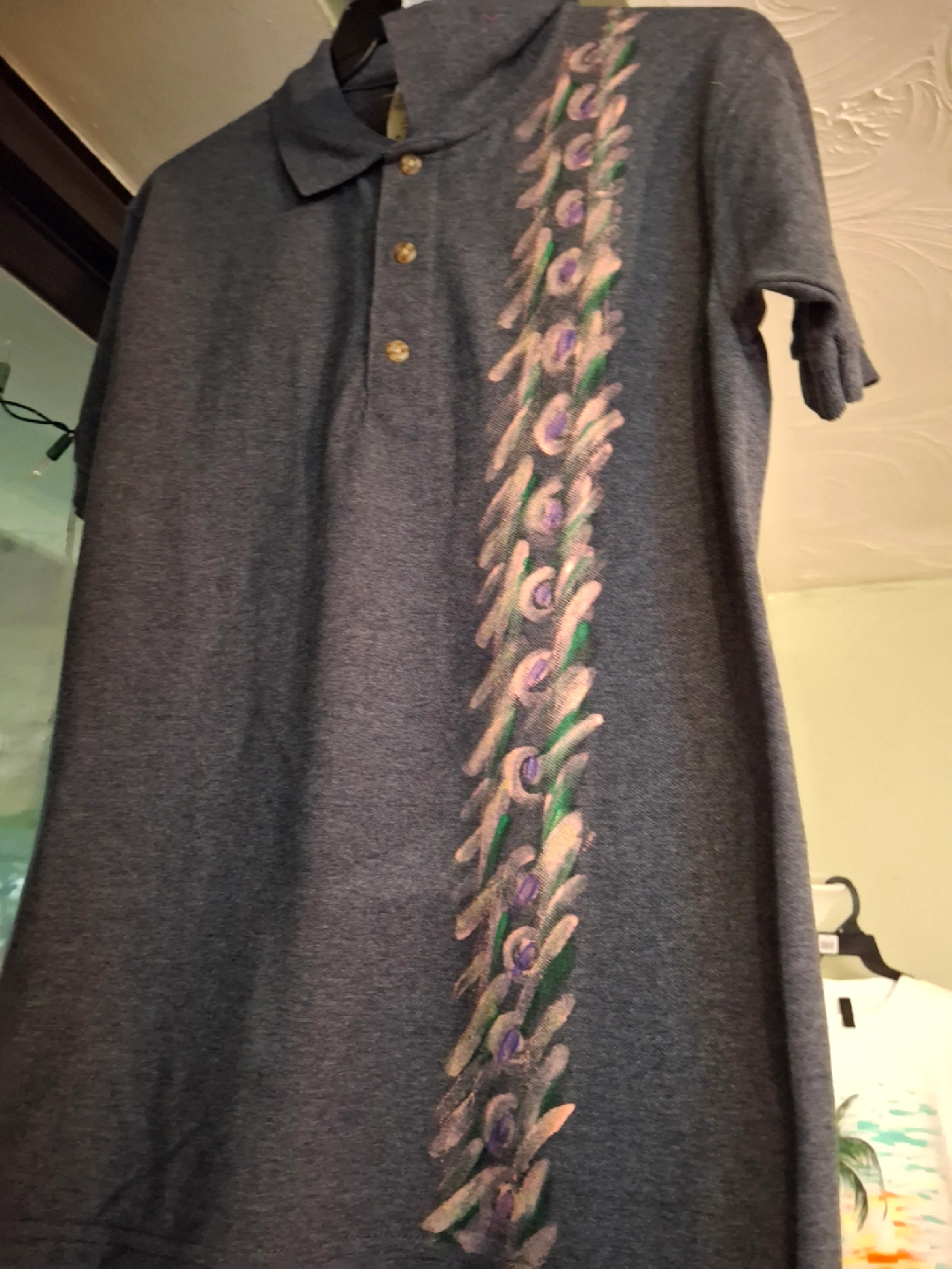 Here's a gently used blue polo shirt that has a unique design down the front! It's in great shape and ready for a new home. Perfect for casual wear or dressing up a bit. Check out the photos for a closer look!