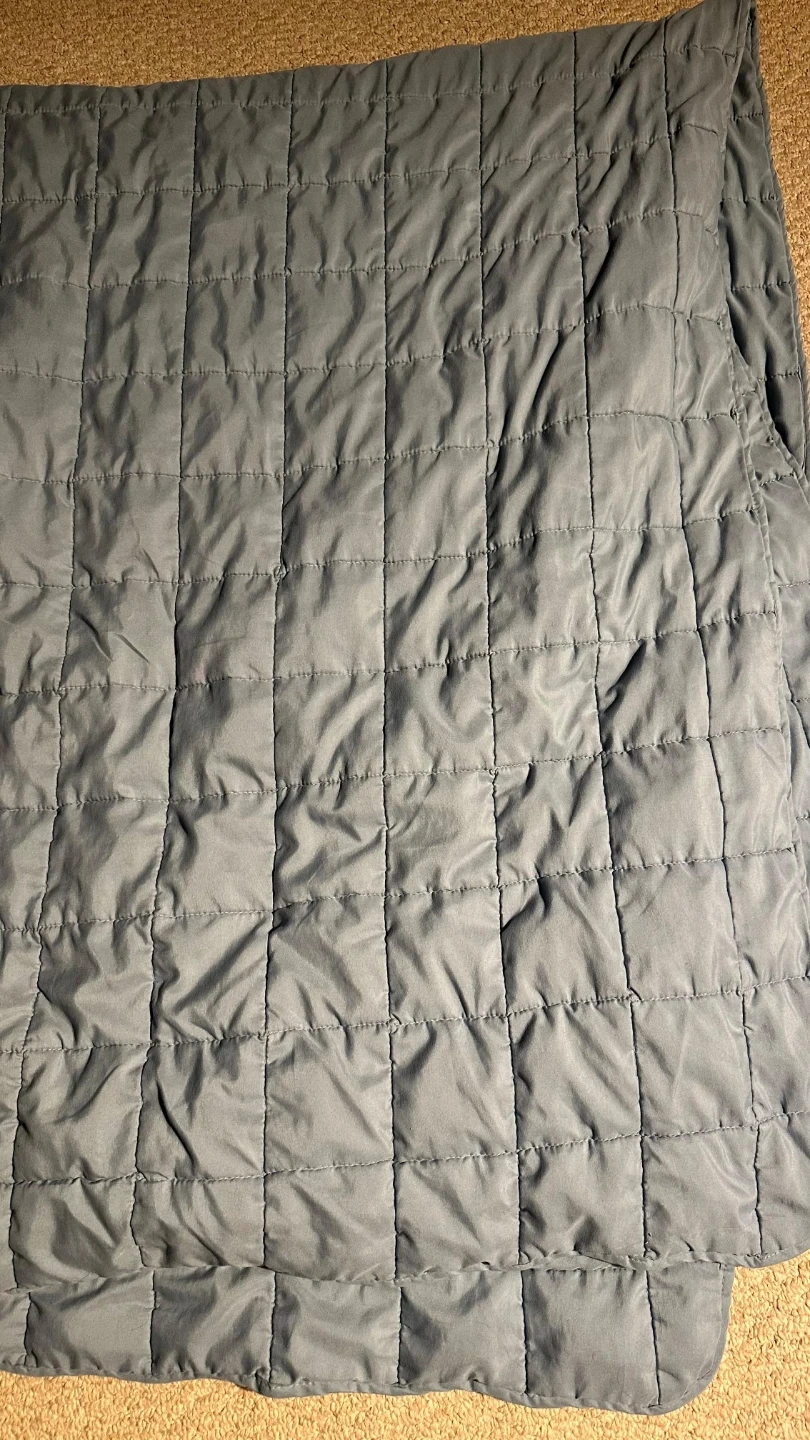 70Here's a cozy grey quilted blanket! It's in great condition and perfect for snuggling up on the couch or adding an extra layer of warmth to your bed