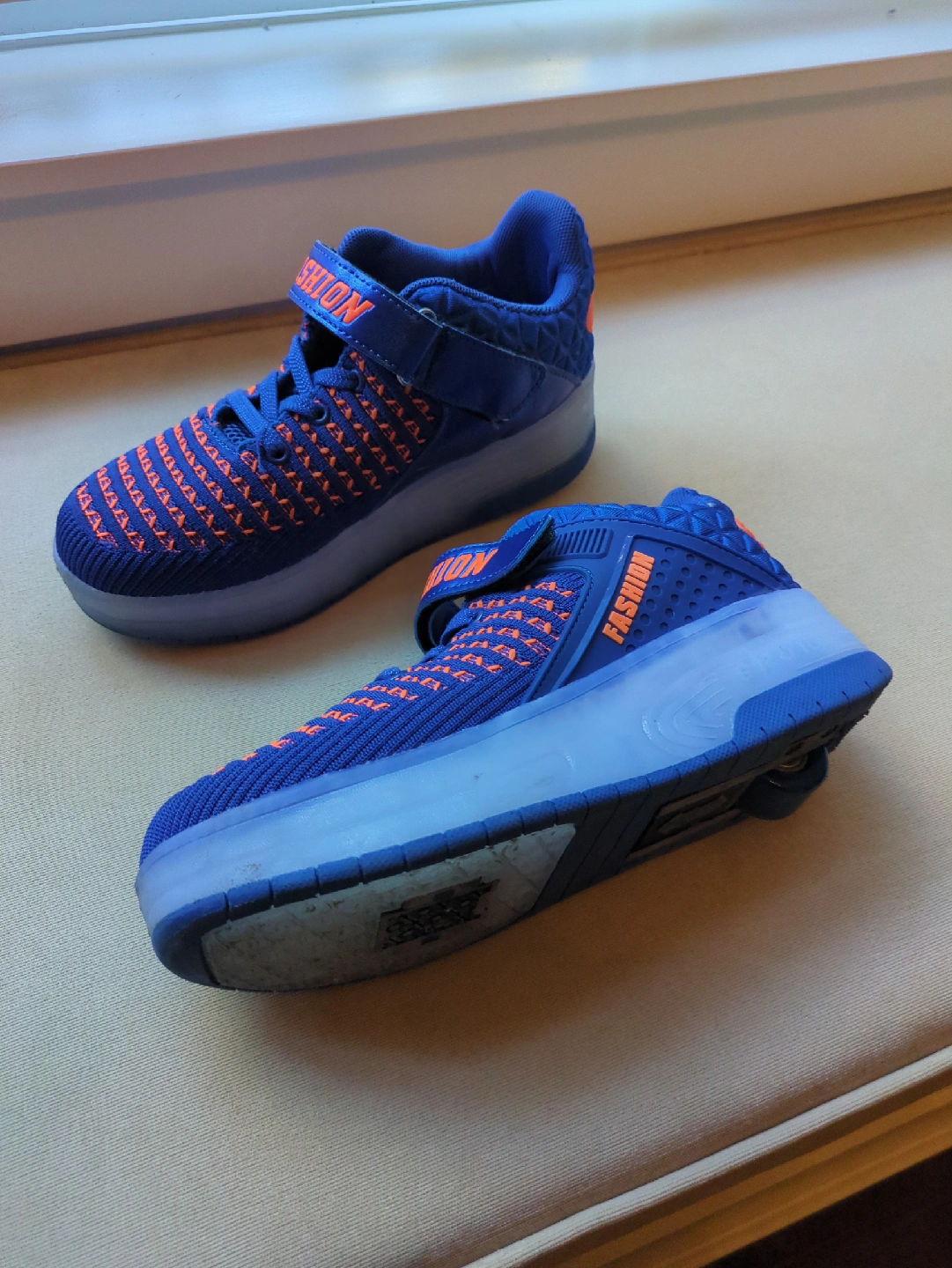 23Selling a pair of blue roller skate shoes. They have a fun design with orange accents and a 'FASHION' detail. The size is 37 (EU). Perfect for some active fun!. retractable wheeles
