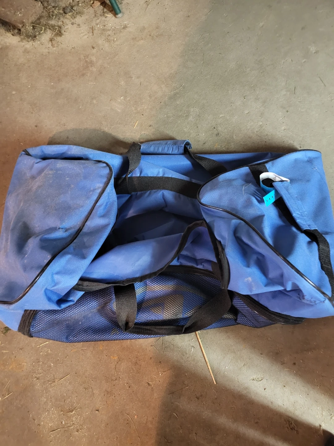 82Selling a blue rolling duffel bag. It's in good condition and ready for your next adventure or storage needs. It features a spacious interior and sturdy wheels for easy transport