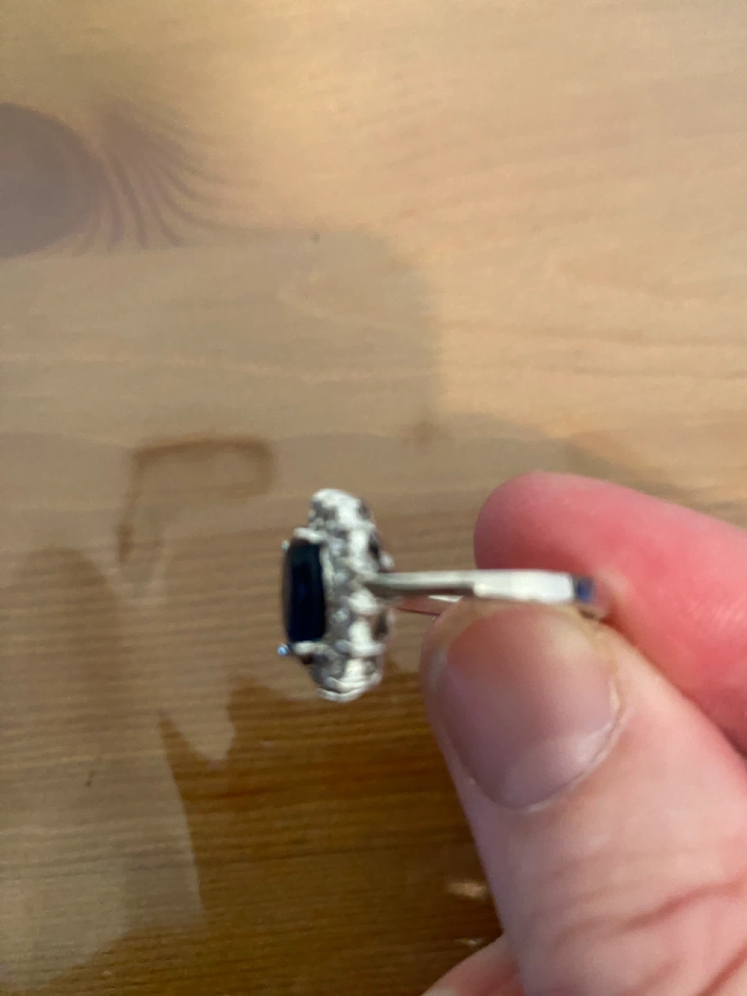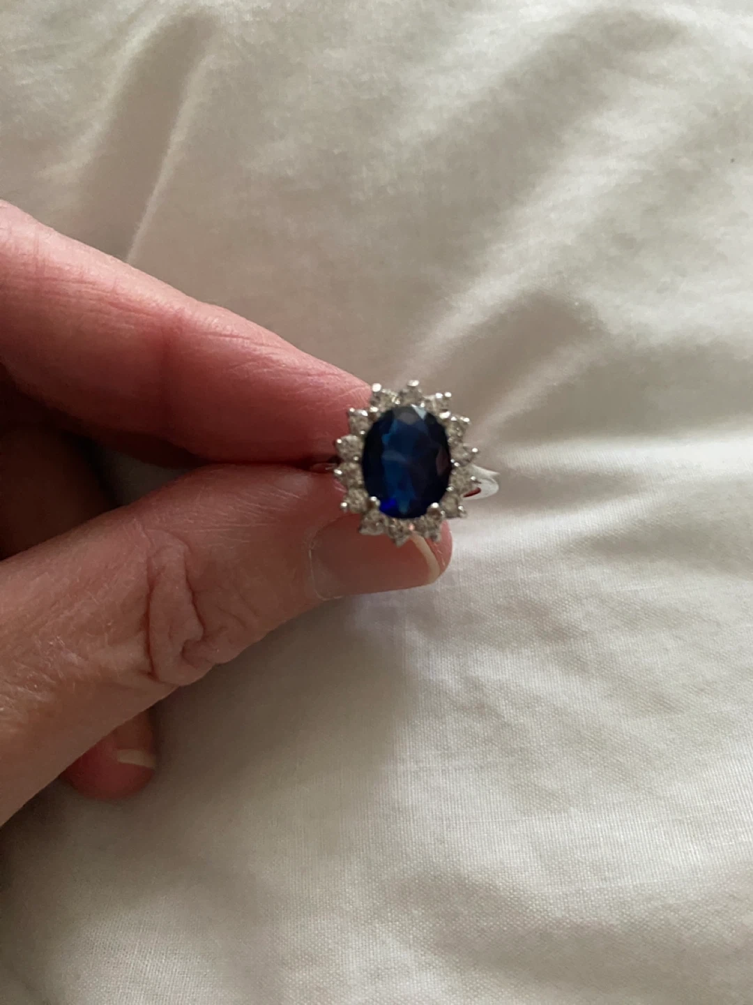 Selling a ring with a blue sapphire style stone surrounded by smaller clear stones. It's in great condition and ready for a new home! 10 k white gold , white sapphire around, size 6. Princess Diana and Kate inspired ring.