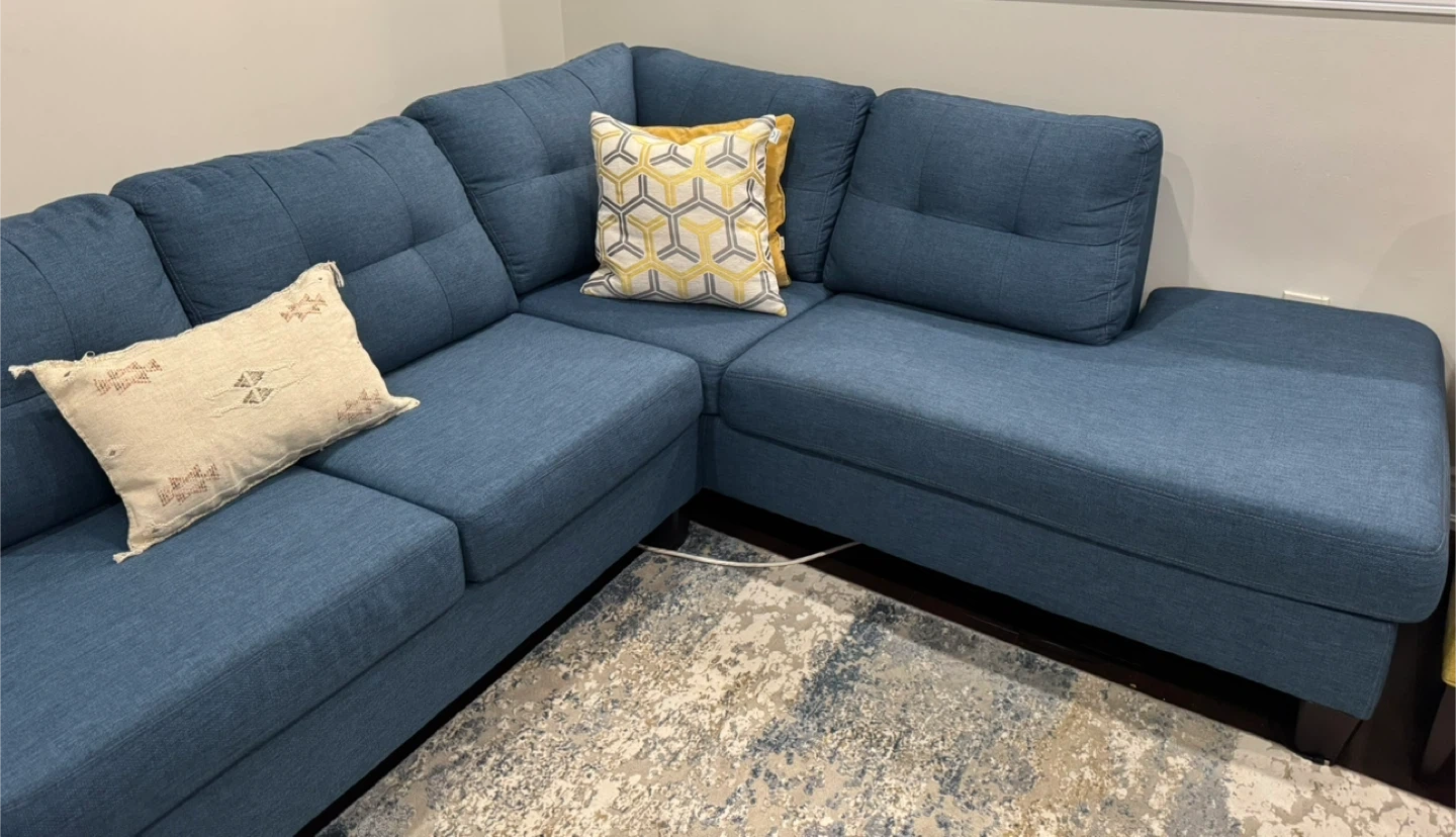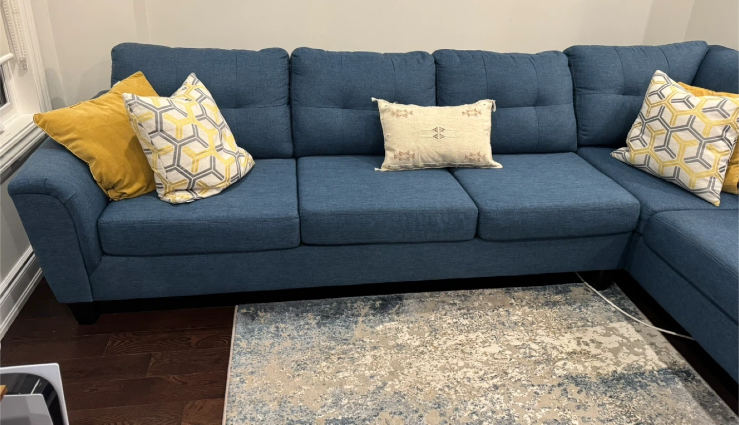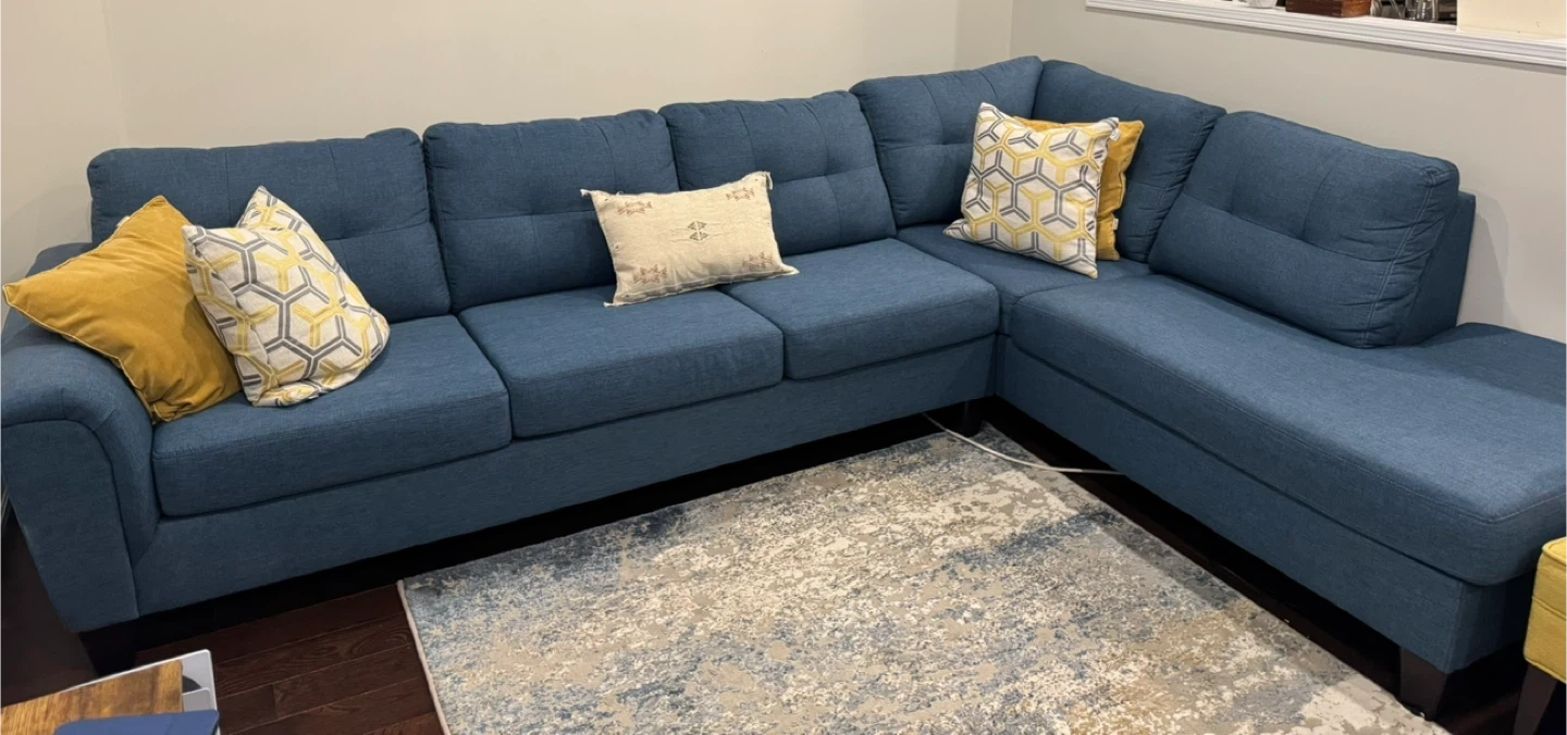 10Selling a comfortable blue sectional sofa. It's in great condition and would be perfect for a living room or entertainment area. The cushions are soft and the fabric is durable. It's a great piece for relaxing and enjoying time with family and friends. Excellent condition, no tears, scratches or marks, as if new. Retail price bought for 2700$ 3 years ago, receipt available.