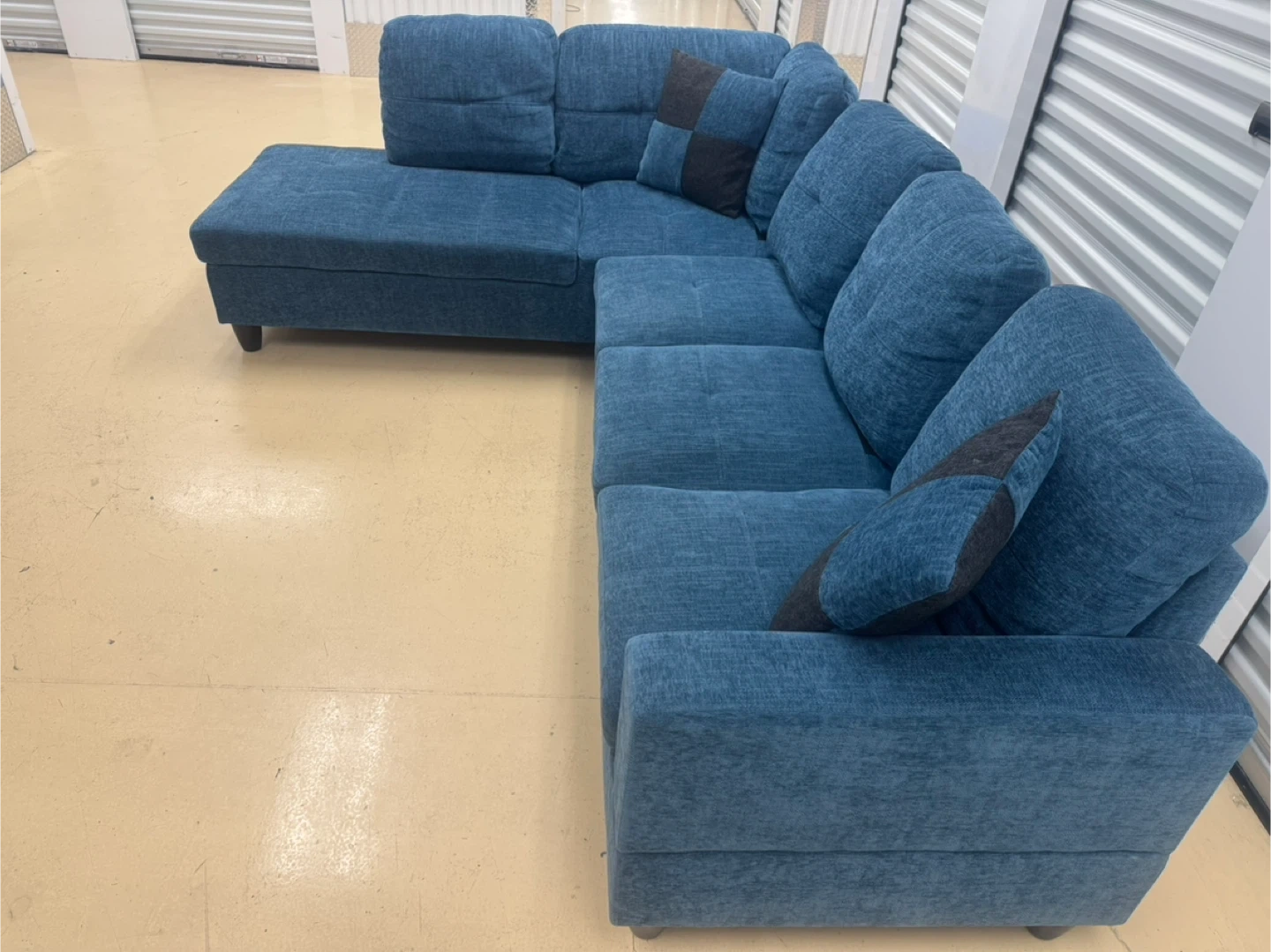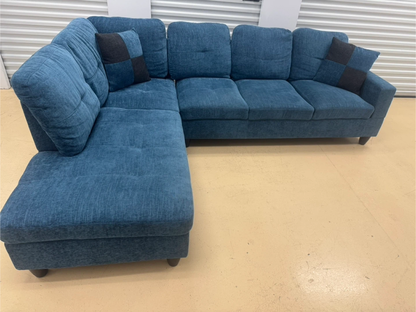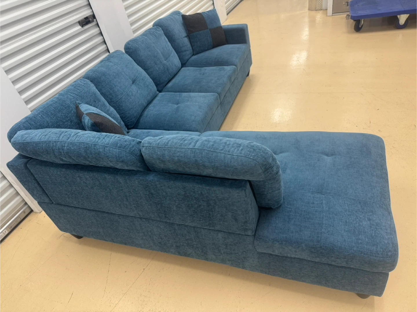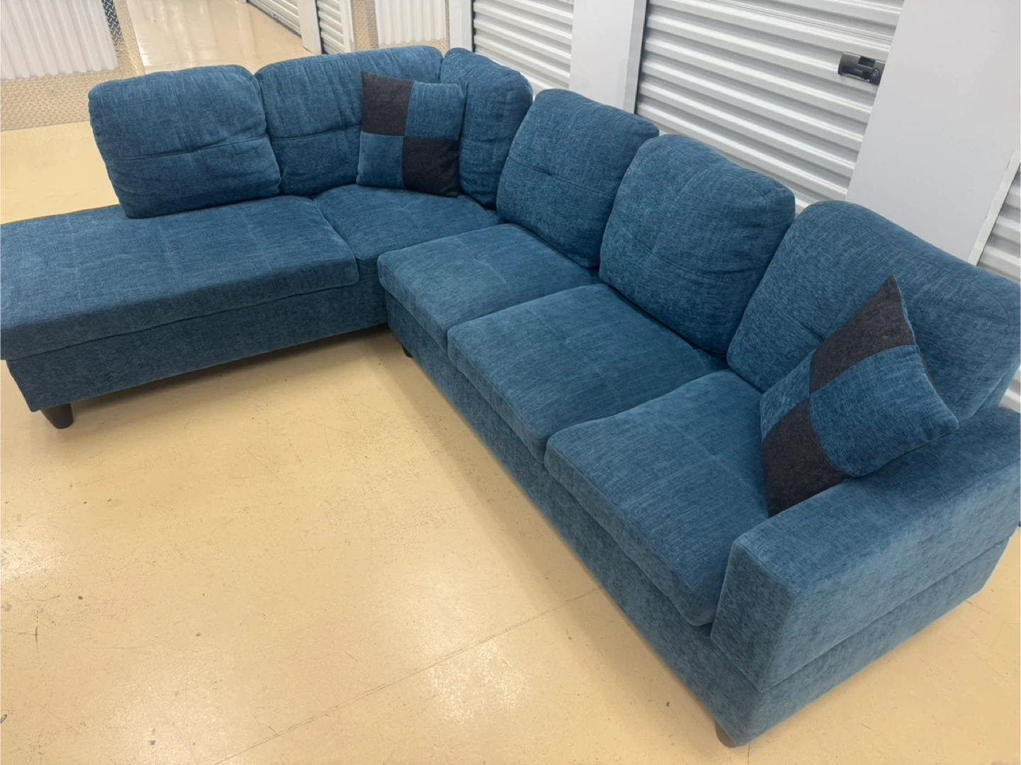 Comfy blue sectional sofa with a chaise lounge. It's in great condition and ready for a new home. The sofa appears to be made of a soft, durable fabric. It's a great size for a living room or entertainment area. The chaise lounge adds extra comfort for lounging good condition home delivery available