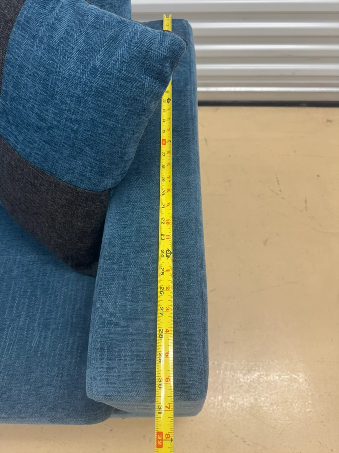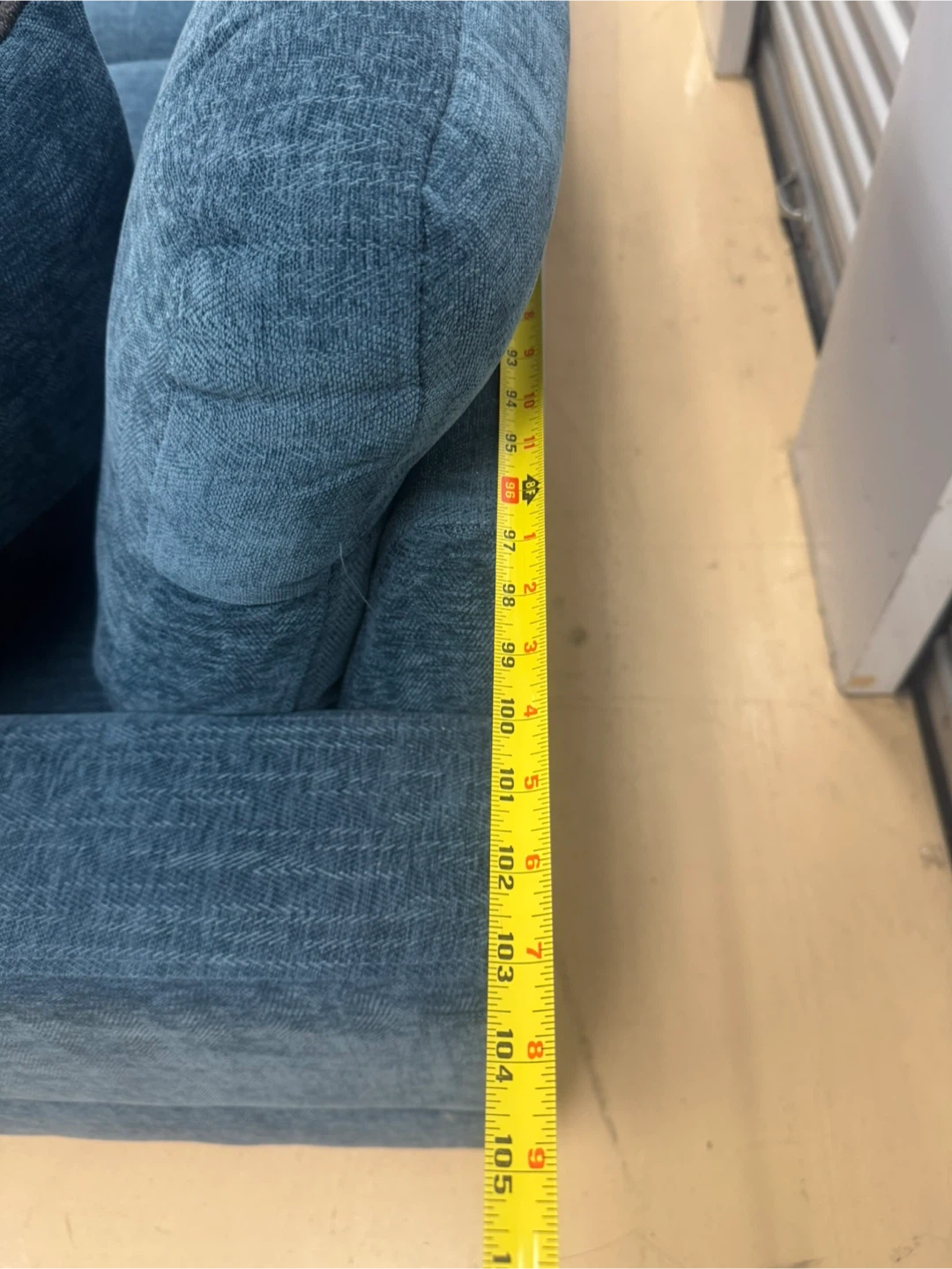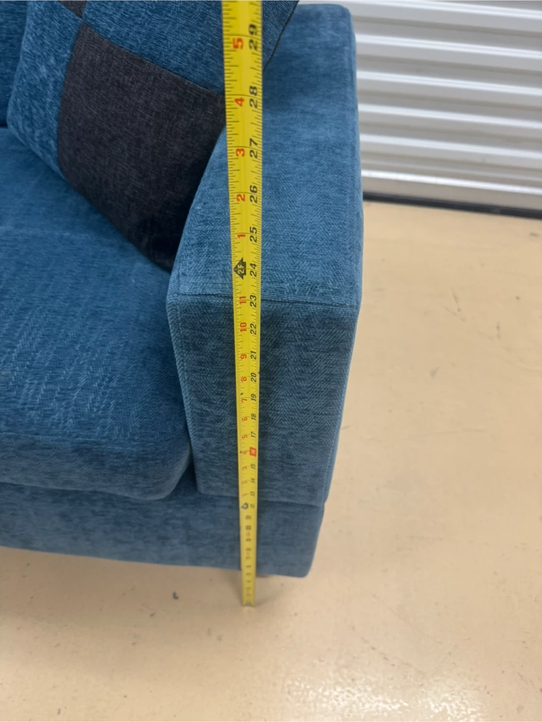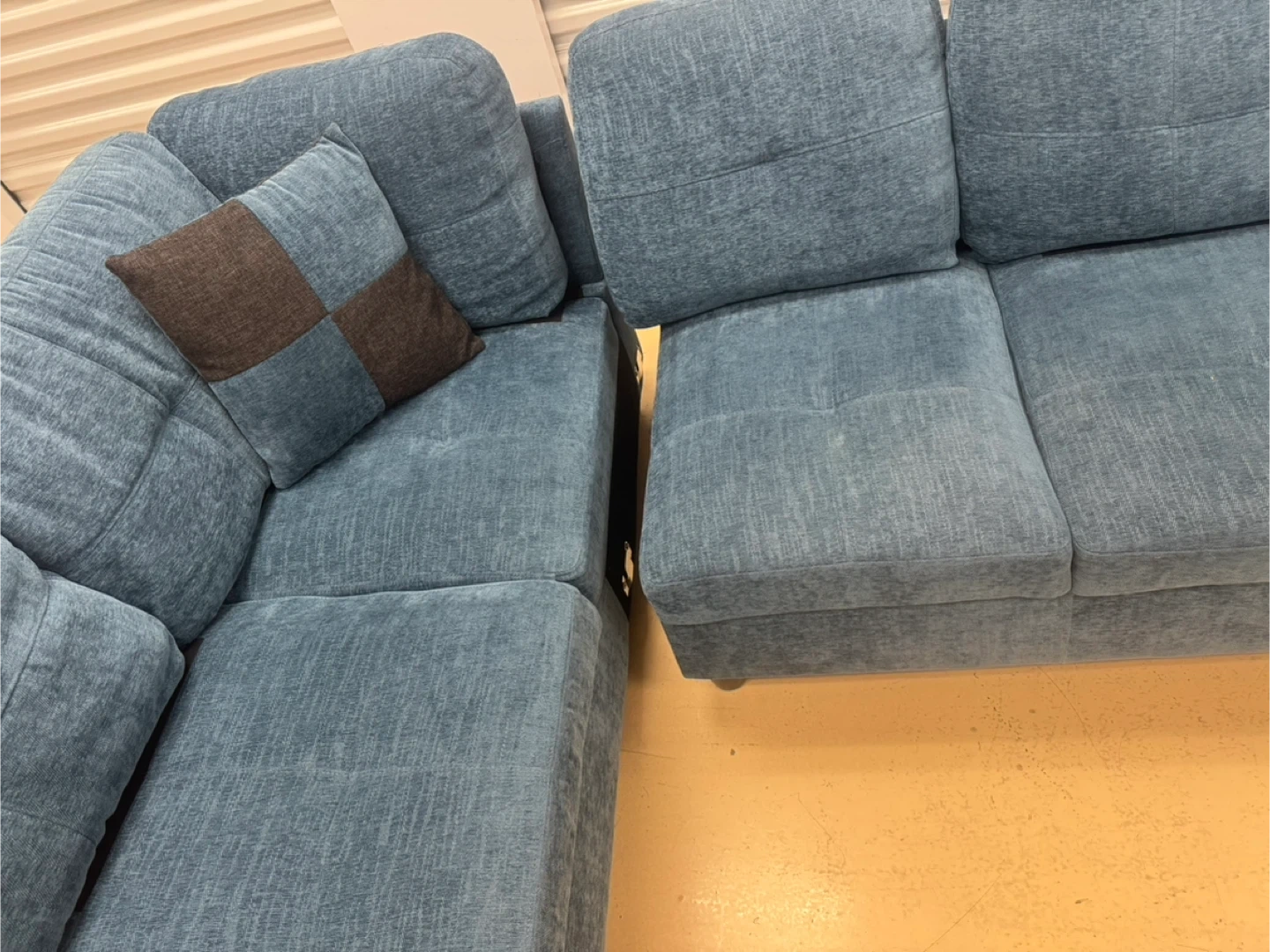Comfy blue sectional sofa with a chaise lounge. It's in great condition and ready for a new home. The sofa appears to be made of a soft, durable fabric. It's a great size for a living room or entertainment area. The chaise lounge adds extra comfort for lounging good condition home delivery available