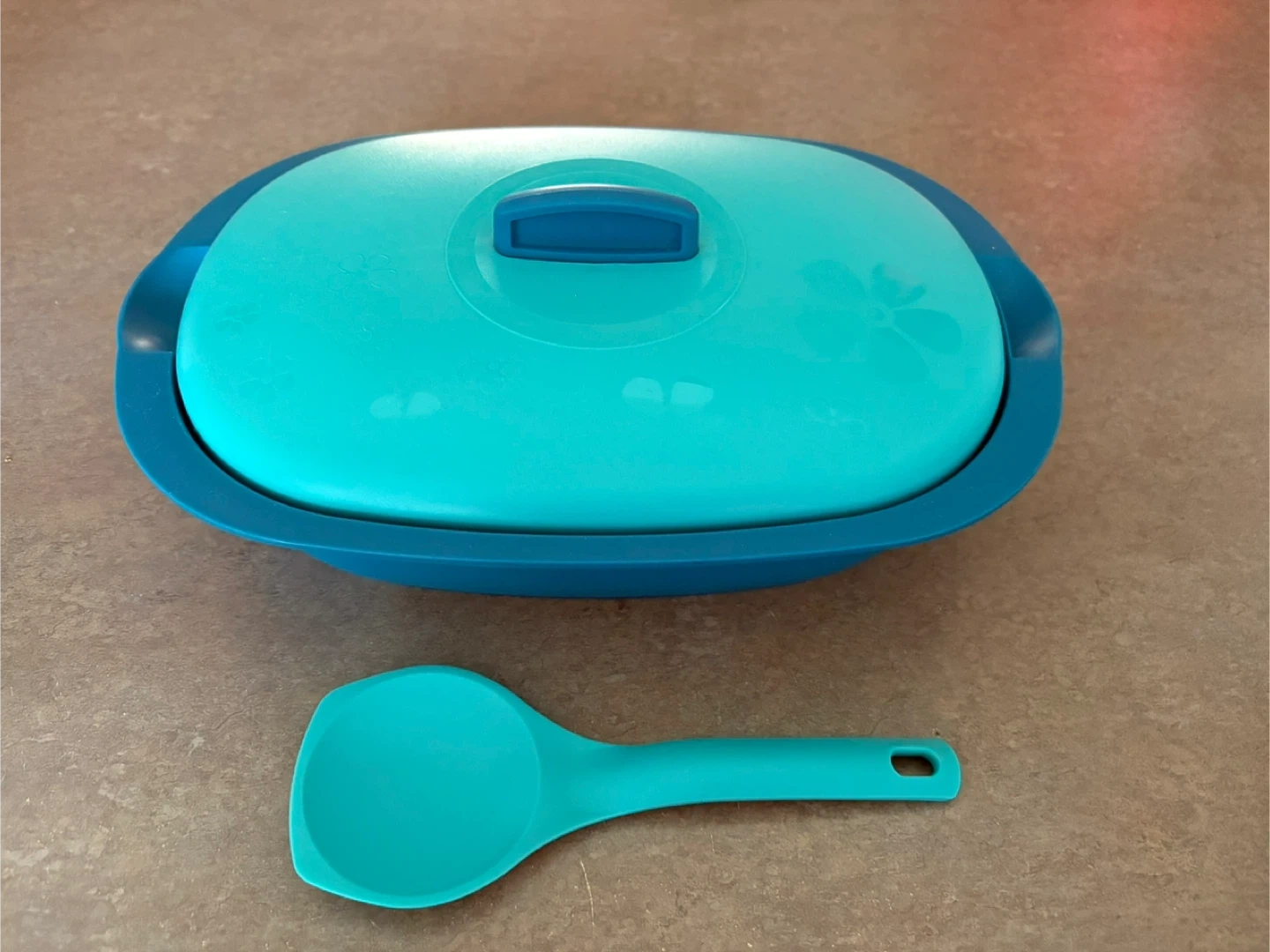 Tupperware blue serving bowls that comes with a matching lid and ladle. It's perfect for serving soups, salads, or any dish you want to keep covered. Brand new Pick up in Barrhaven