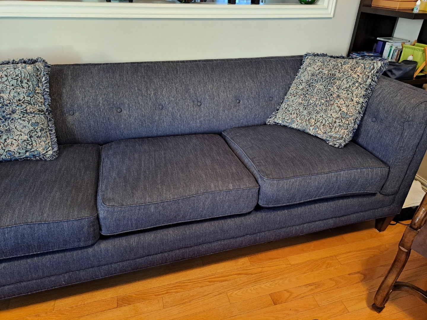Selling a comfy blue sofa! Price:$200 Denim Blue ✔ Dimensions: 92" L x 36" D x 32" H ✔ Condition:Lightly used, very clean, no stains or odors ✔ From a smoke-free, pet-free home This sofa has been gently used and is in excellent shape—perfect for a cozy living room or guest space. The cushions are firm, the fabric is intact.