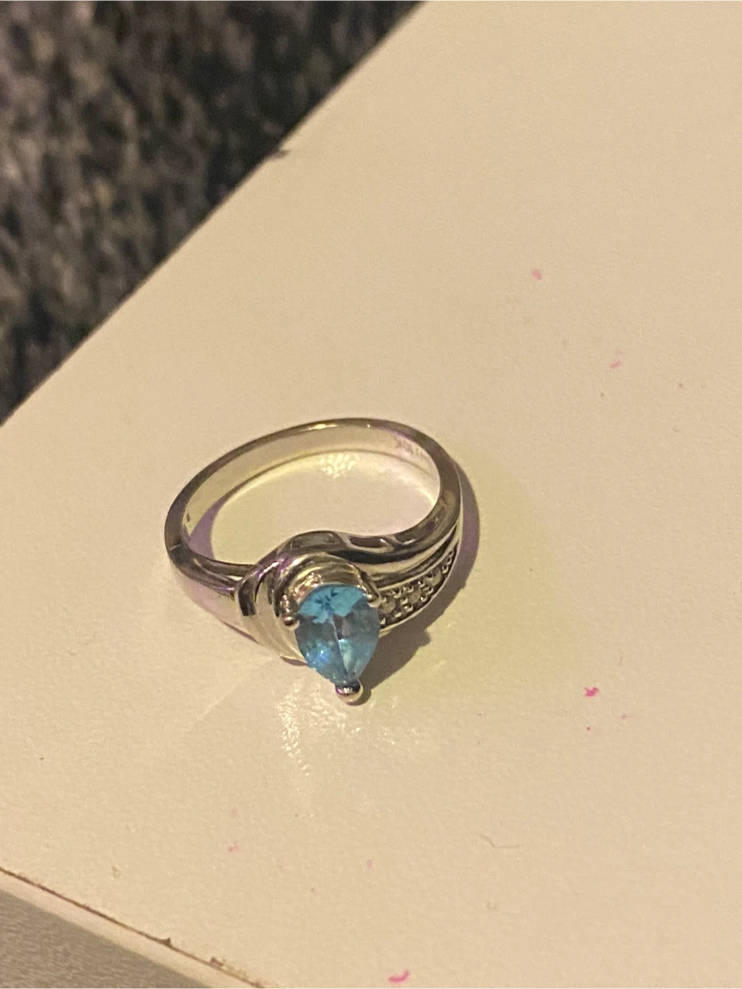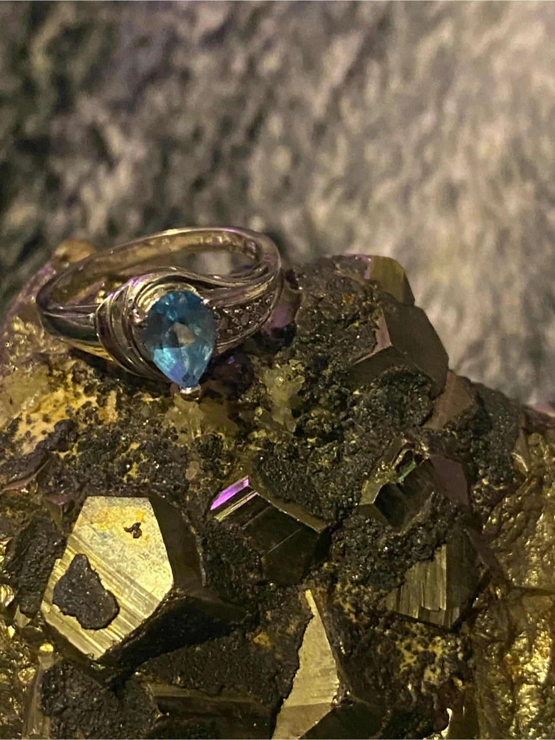 98A lovely silver-tone 10 karat 3 grams gold ring featuring a pear-shaped blue stone. It's in great condition and ready for a new home!