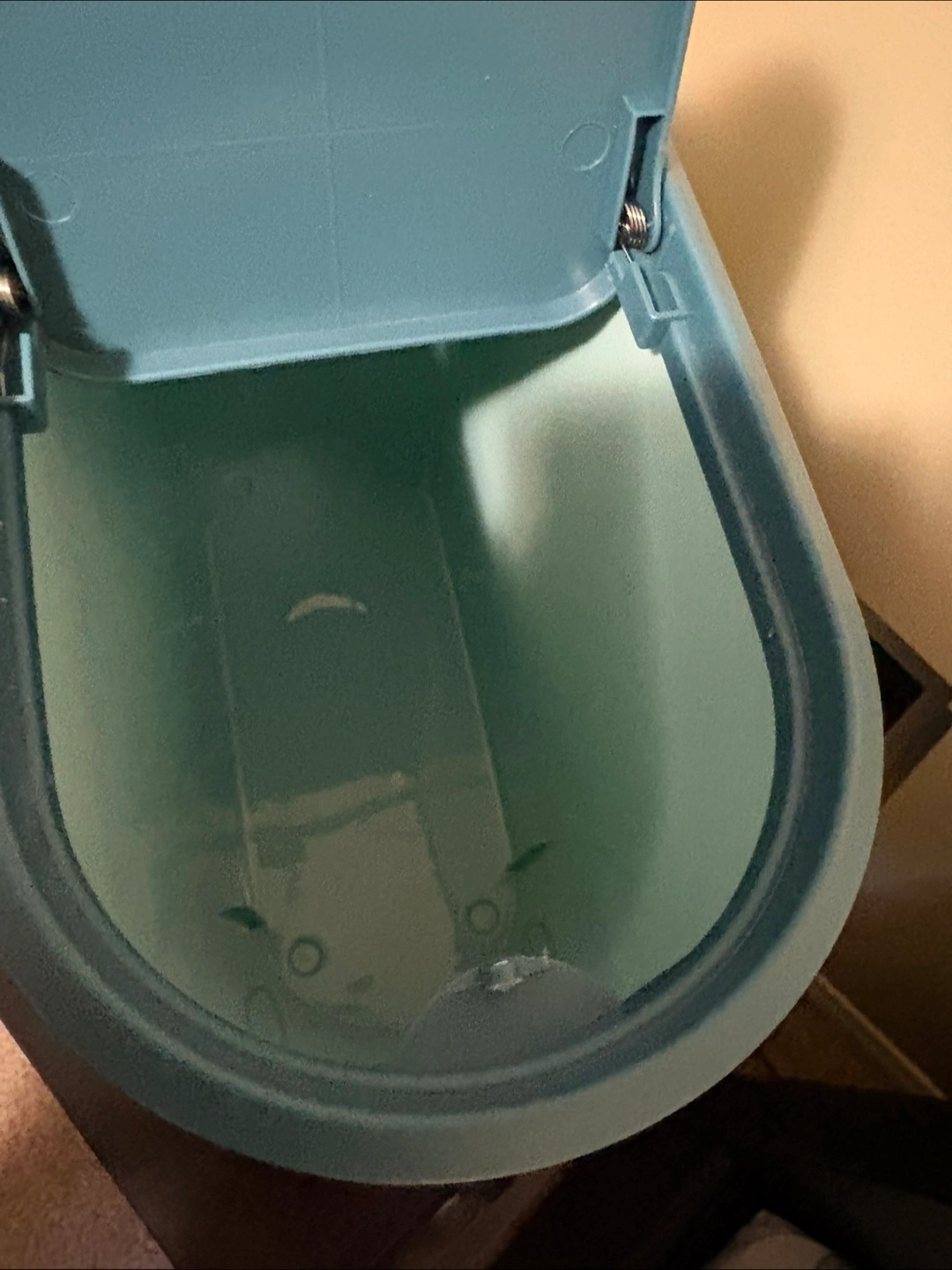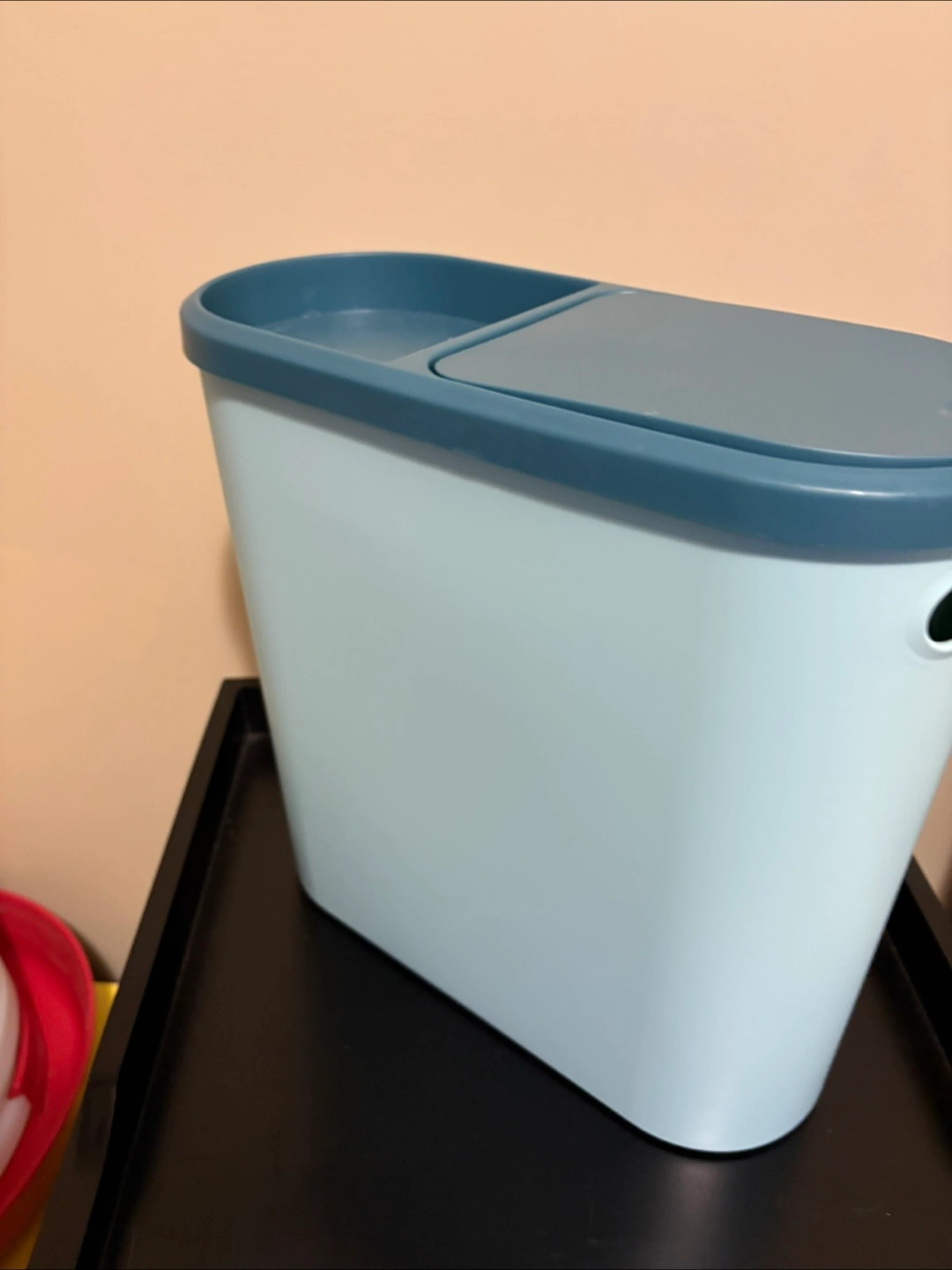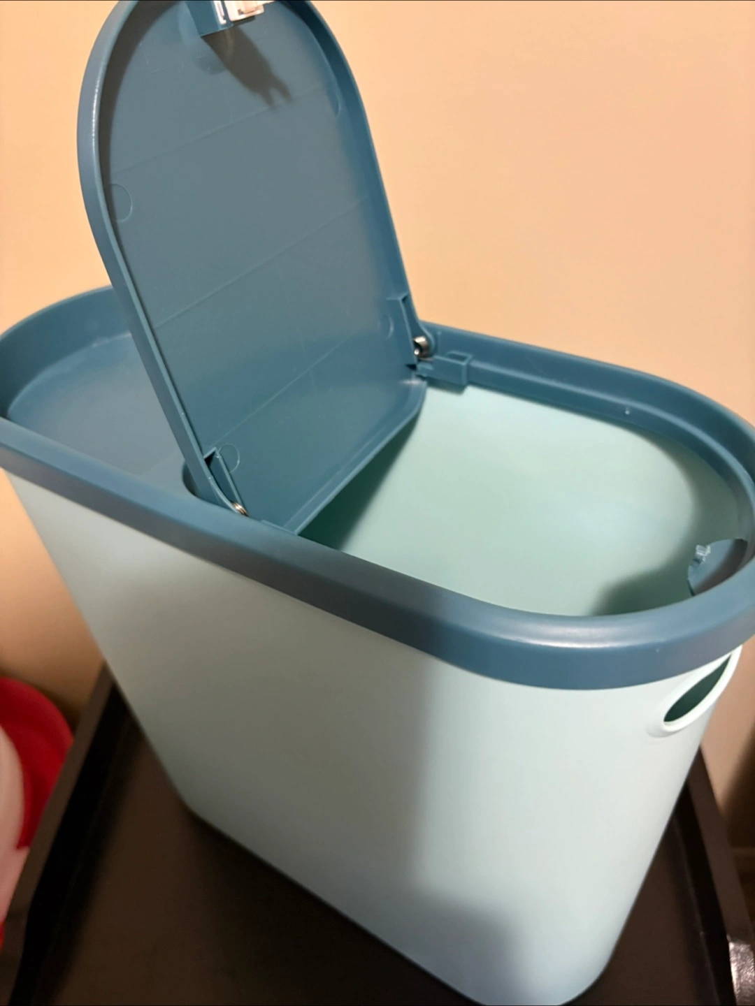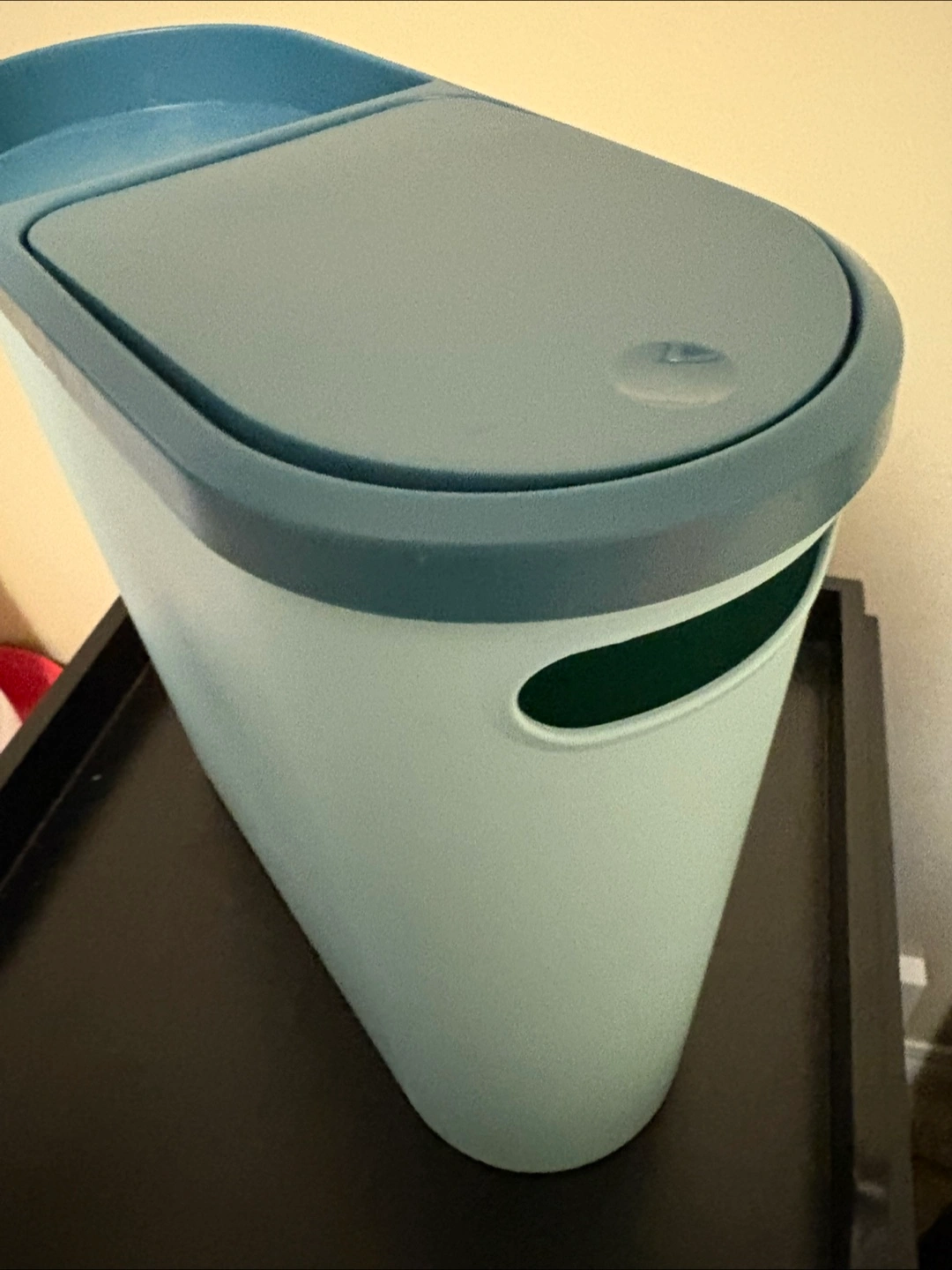 I have a blue storage bin with a lid for sale. It's in good condition and ready to help you organize your space!great garbage can for bathroom or kitchen