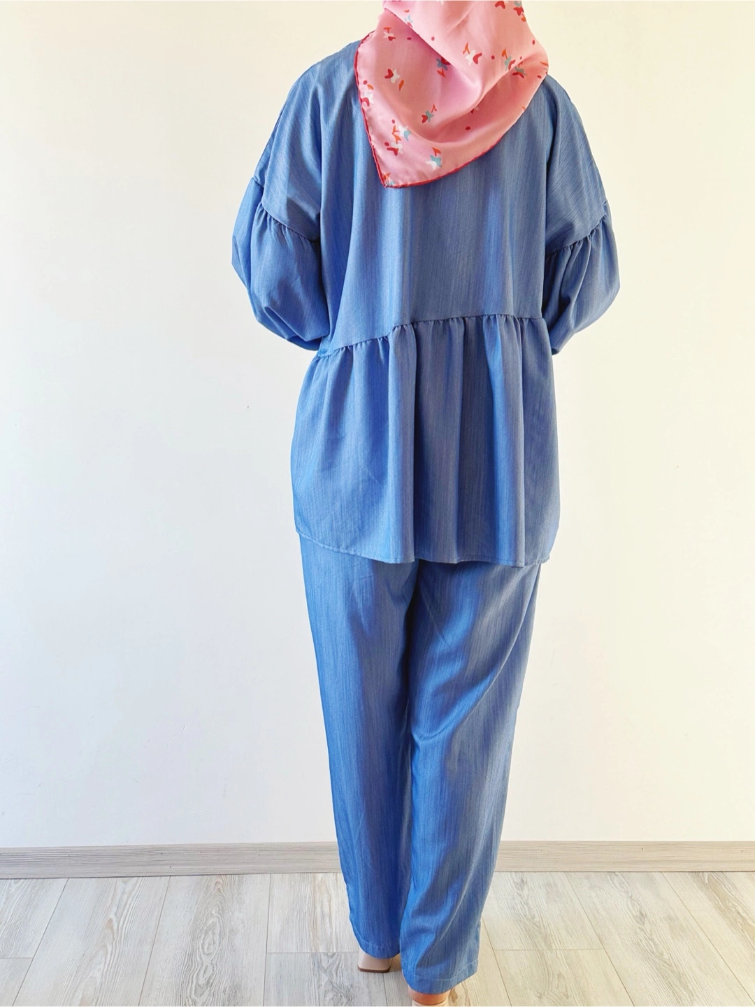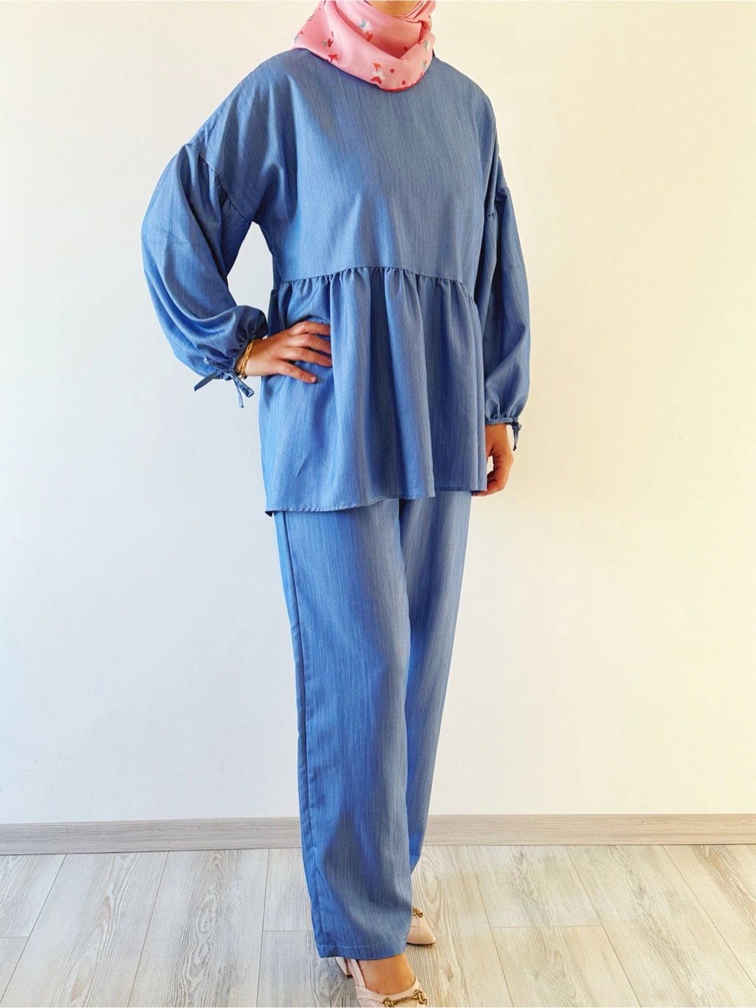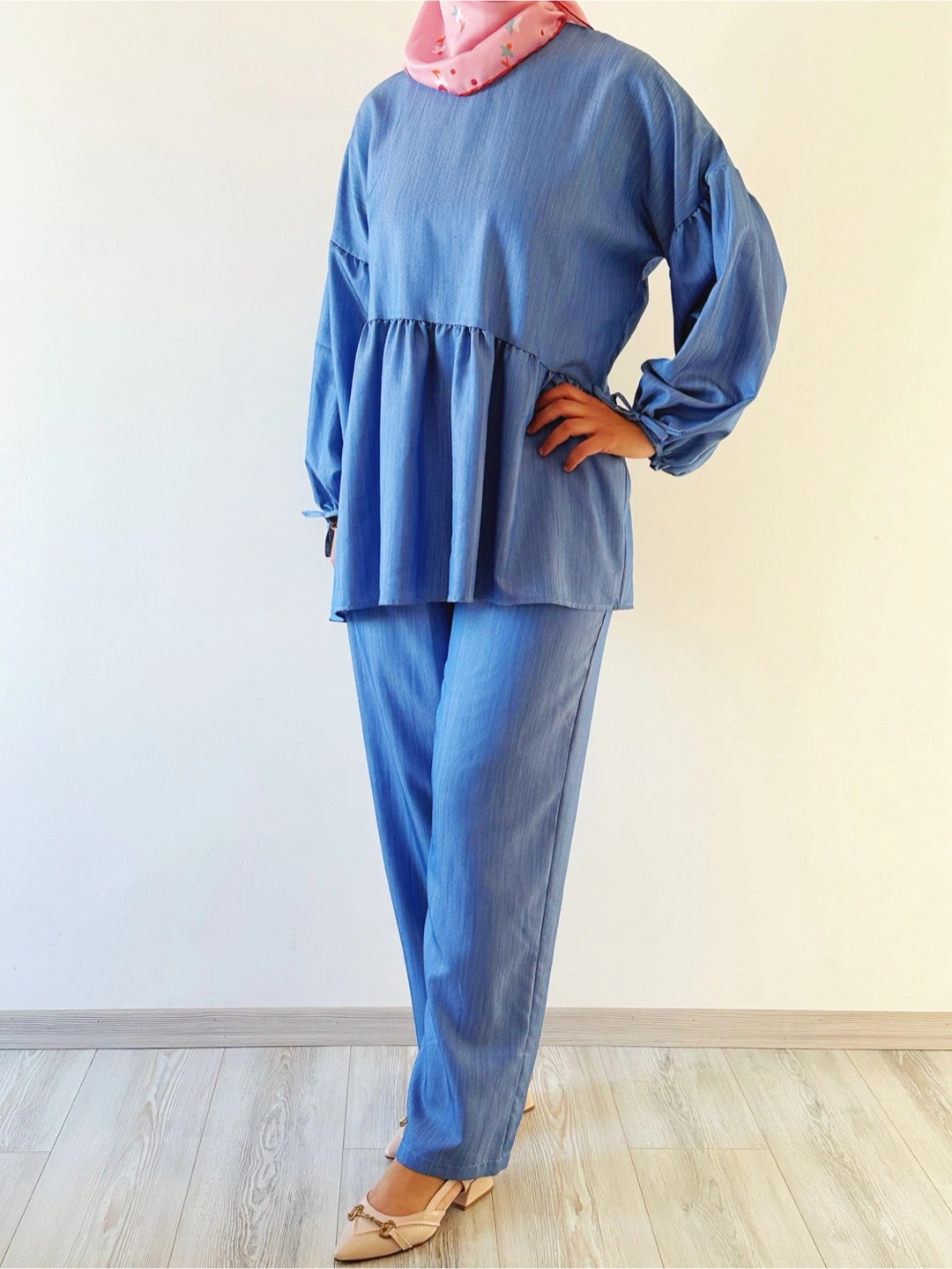 Selling a cute blue stylish two-piece set! It includes a top and pants, perfect for a casual and stylish look. The top has a peplum style with long sleeves. The pants are a straight leg style. Great for everyday wear!