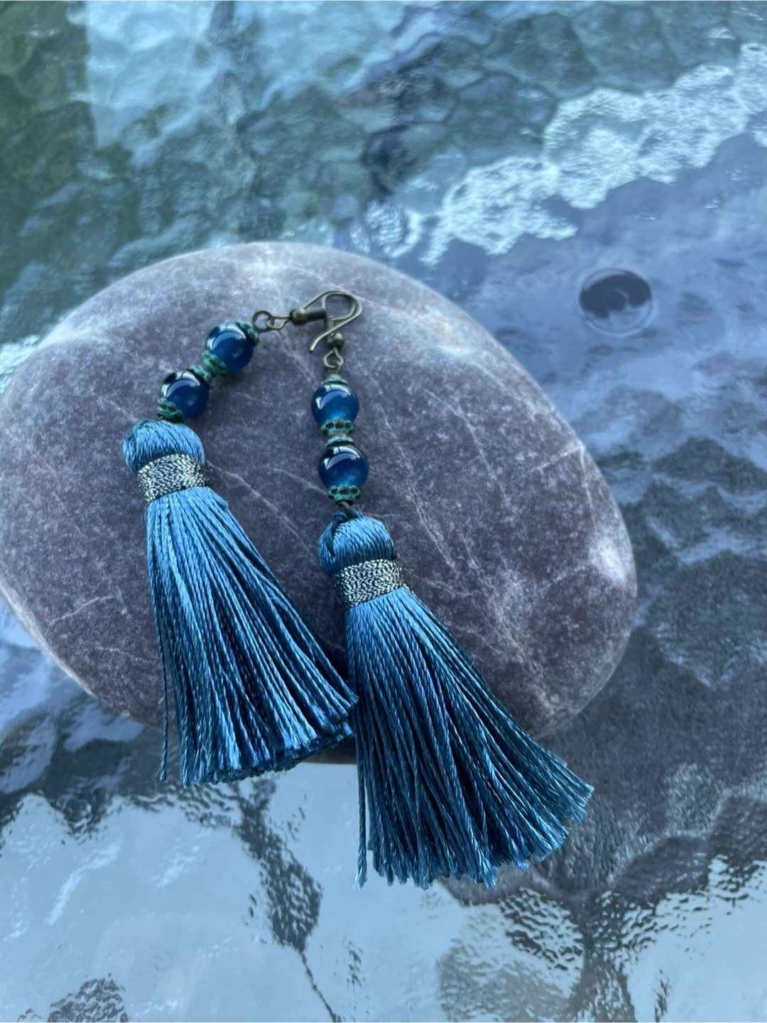 Here are a pair of blue tassel earrings with beaded accents. They are in great condition and ready to add a pop of colour to your outfit